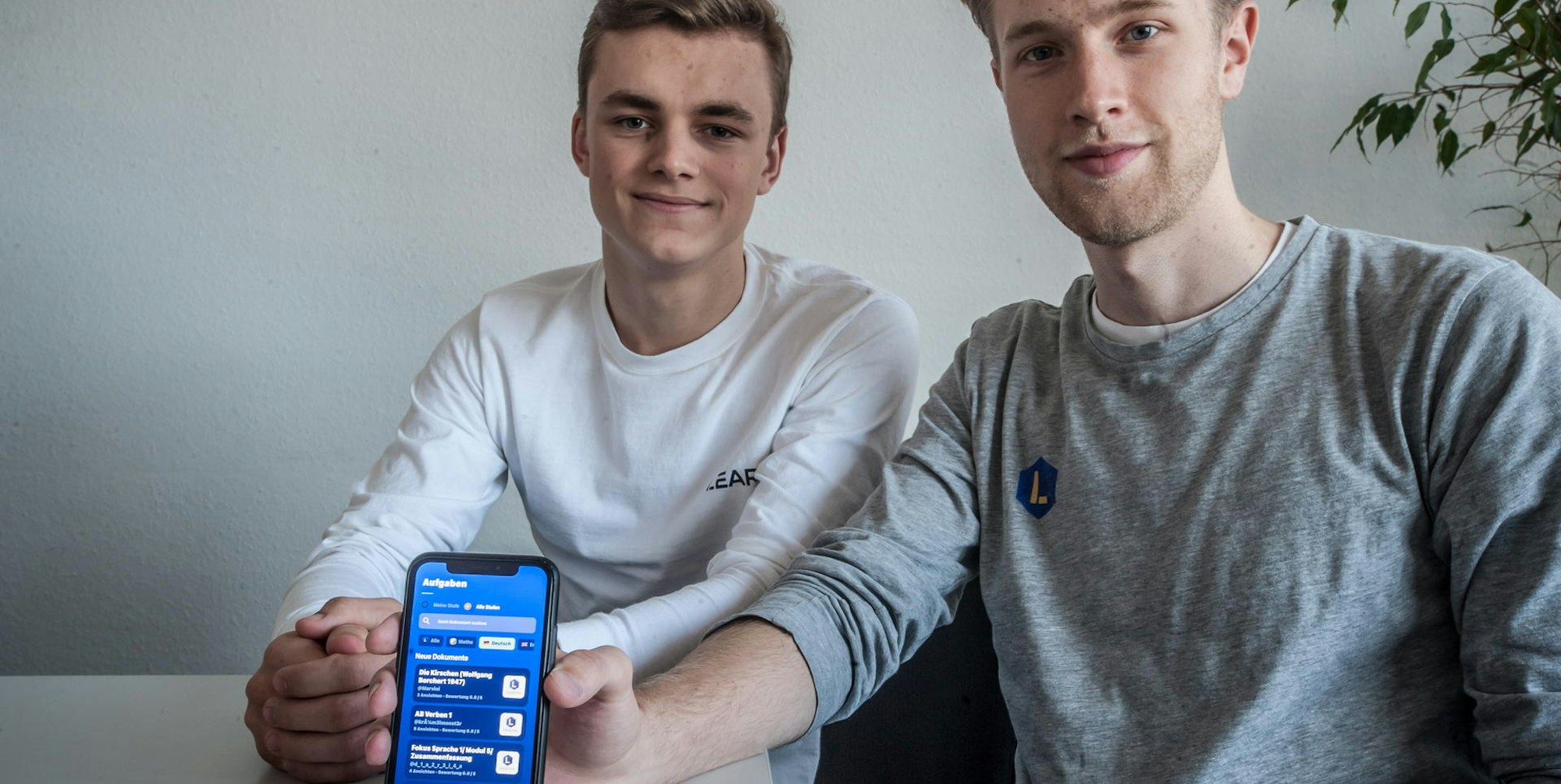 Oskar Schnee (l.) und Eldrick Lindner mit ihrer App: Es gehe nicht ums „Abschreiben“, erklären sie. „Learnu“ ist eine „community basierte Lernplattform“ und soll Schüler motivieren.