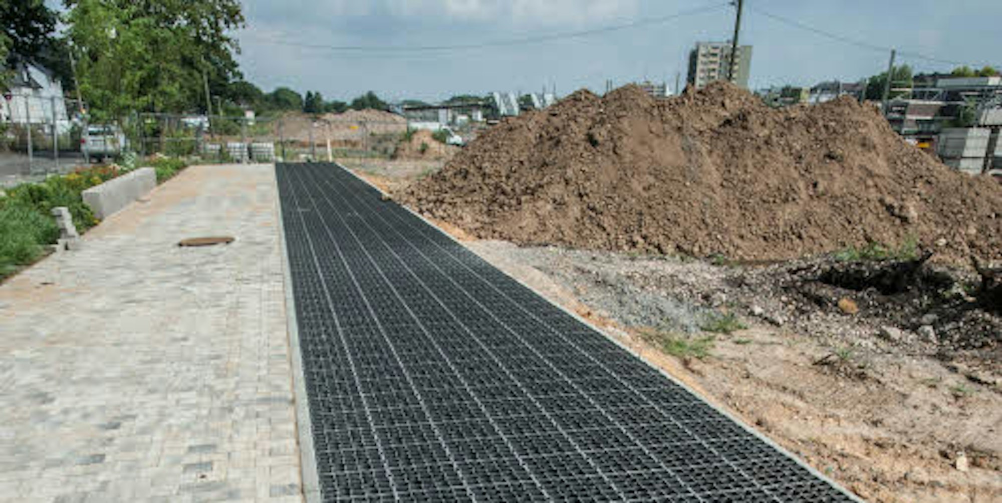 Leverkusen – Der Rad- und Gehweg, der sich zwischen der früheren Bahner-Siedlung am Rande der Opladener Neustadt und der Neuen Bahnstadt West hinzieht, hat den Projektnamen „Grünes Band“. Weshalb gerade dort neben dem frisch gepflasterten Weg ein ebenso breites graues Gitter aus Plastik den Boden bedeckt, hat nicht wenige Beobachter stutzen lassen.