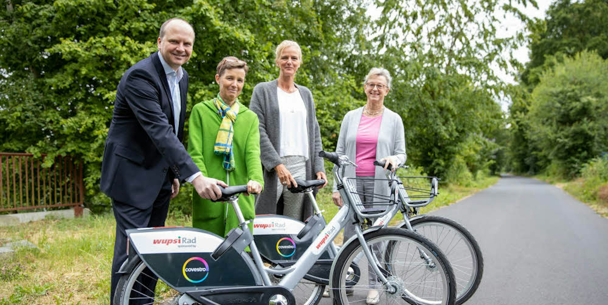 Mit Wupsi-Leihrädern auf dem Radweg Balkantrasse (v. l.): Daniel Koch (Covestro), Petra Haller (Förderverein), Baudezernentin Andrea Deppe und Ute Müller-Eisen (Covestro).