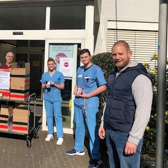 Pakete voller Schokolade und Energiedrinks hat Marcel Avermiddig (2.v.l.) von den Leverkusener Ultras dem Team des Remigius Krankenhauses in Opladen diese Woche übergeben.