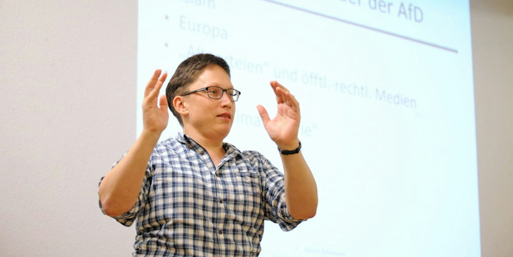 Behrensen erklärte, dass die AfD hauptsächlich über Feindbilder funktioniere. Dabei zentral: der Islam, Europa, Altparteien, öffentlich-rechtliche Medien, die so genannte „Gender-Ideologie“ und seit neuestem die von der Partei als Hysterie verschriene Sorge ums Klima. Behrensen arbeitete mehrere Beispiele aus den Parteiprogrammen der AfD durch, um an ihnen die Erschaffung solcher Feindbilder genauer zu erläutern.