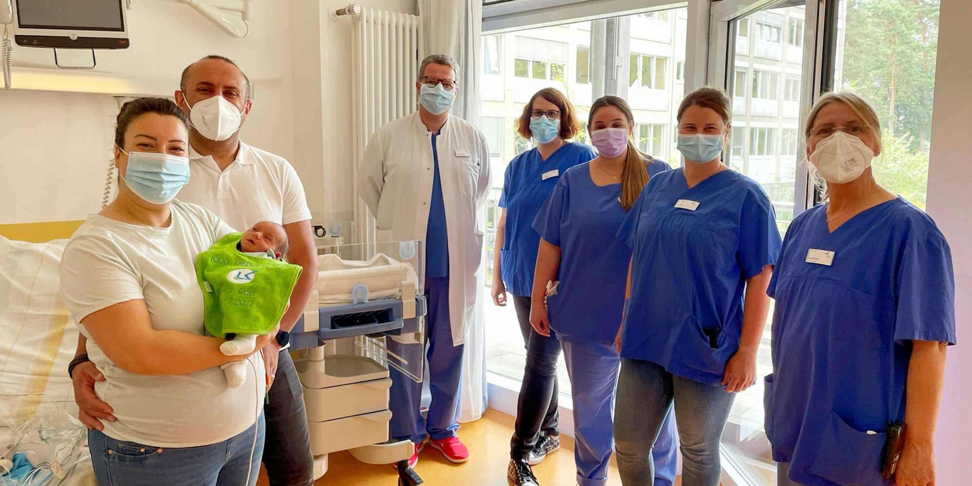 Gratulation im Klinikum (von links): Familie Gülseren, Seyit Can und Ünal I, Oberarzt Michael Ulbricht, Leitende Hebamme Alin Glaus, Kinderkrankenschwester Vanessa Schäfer, Hebamme Janina Kraus und Stationsleiterin Heike Dellhofen.