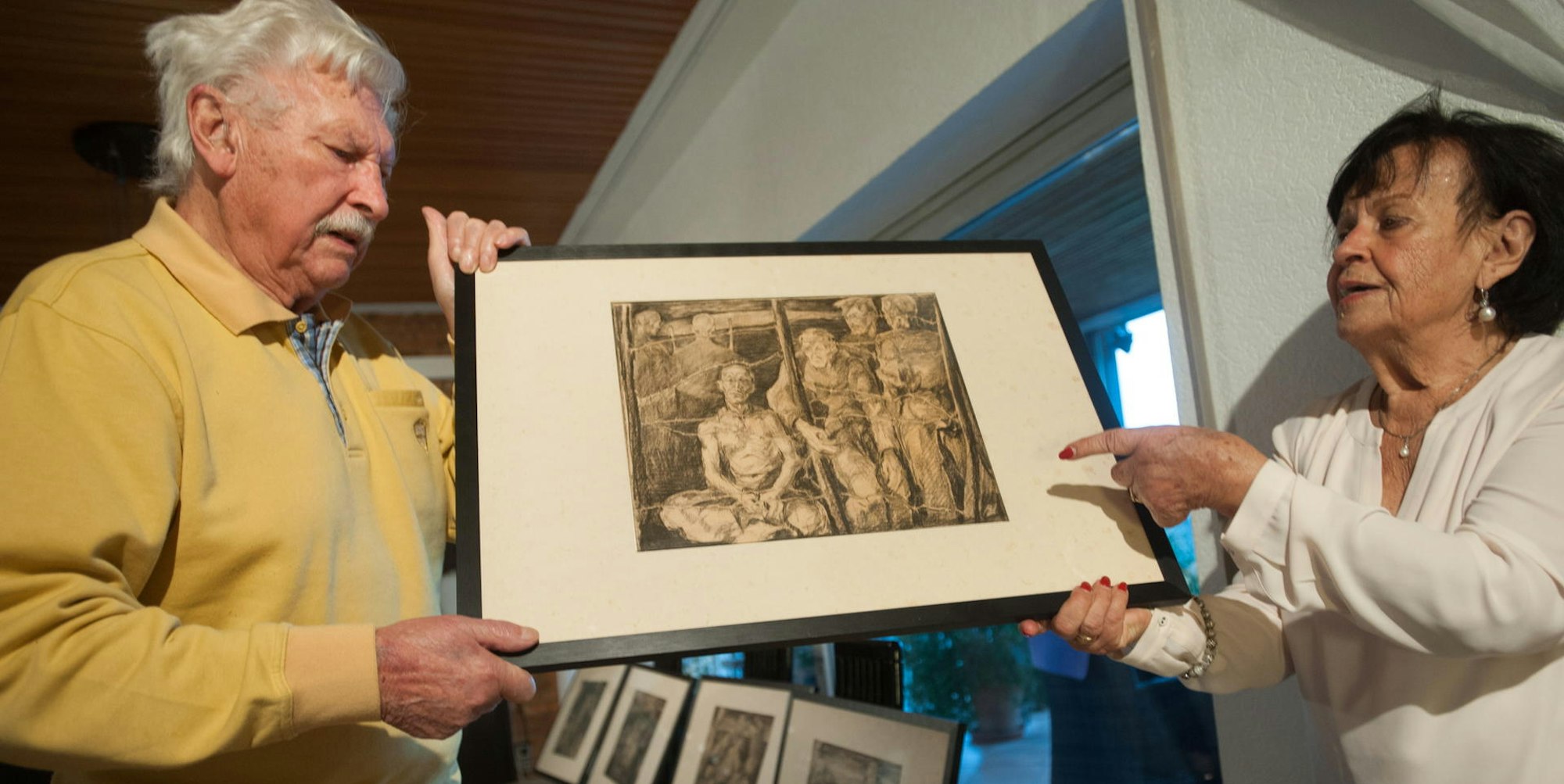 Hinter Stacheldraht zusammengepferchte Menschen: Christel und Heinz Zaun zeigen eines jener Bilder, die Christel Zauns Vater Walter Bernstein in den Jahren seiner Kriegsgefangenschaft malte und mit denen er die Kriegserlebnisse verarbeitete.