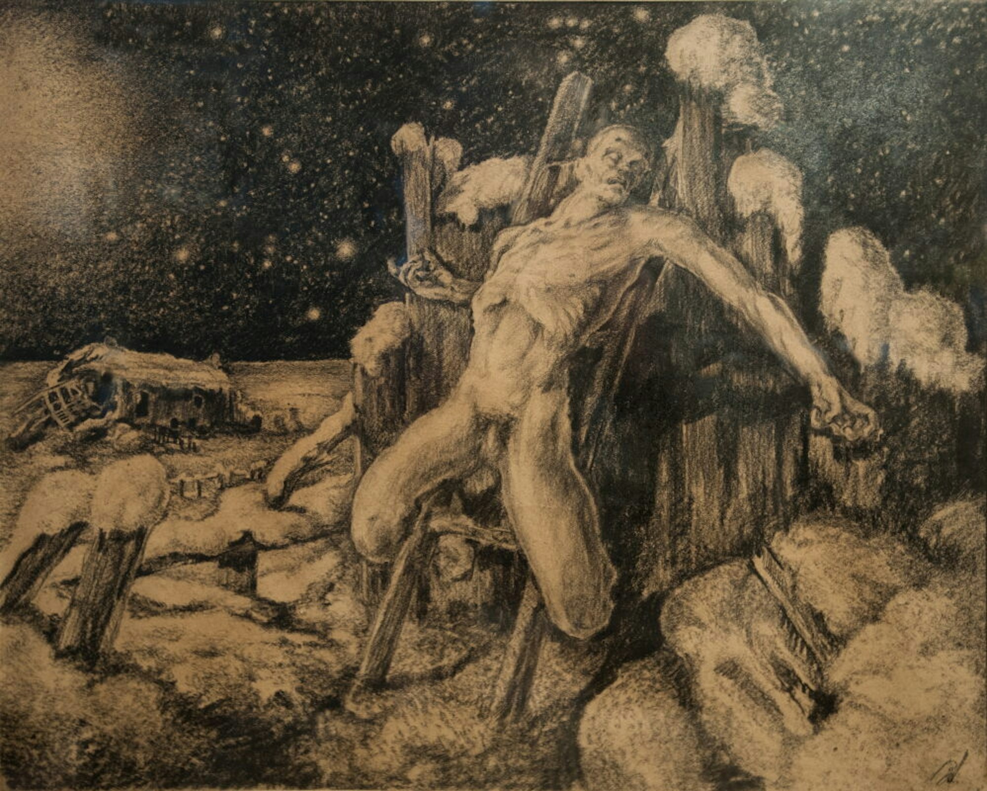 Denn als er aus der Gefangenschaft entlassen wurde, entdeckte ein offenbar künstlerisch gebildeter amerikanischer Soldat die Zeichnungen und wusste sofort: Die sind besonders. „Er bat meinen Vater, die Bilder mitnehmen zu dürfen, um sie in den USA vielleicht anderen Kennern zu präsentieren“, sagt Christel Zaun. Walter Bernstein stimmte zu. Er ging zur Familie, die mittlerweile in Oberpleis lebte. Seine Zeichnungen wurden in entgegengesetzter Richtung über den Atlantik gebracht. Und drüben wurden sie dann tatsächlich bei einer Ausstellung von in Kriegsgefangenschaft entstandener Kunst gezeigt. In New York. Im berühmten Guggenheim-Museum – was schon für jeden professionellen Künstler eine Sensation ist. Für wie Walter Bernstein war es ein Wunder. Und irgendwann Jahre später, erzählt Christel Zaun, habe dann der Postbote bei einem Onkel der Familie, dessen Adresse der Kriegsgefangene seinerzeit im Lager als Heimatadresse angegeben hatte, geklingelt und ein Paket abgegeben. „Er rief uns an und sagte: Ich habe hier etwas bekommen, das, glaube ich, dem Walter gehört.“ Bilder. Dunkel, düster, eindringlich.
