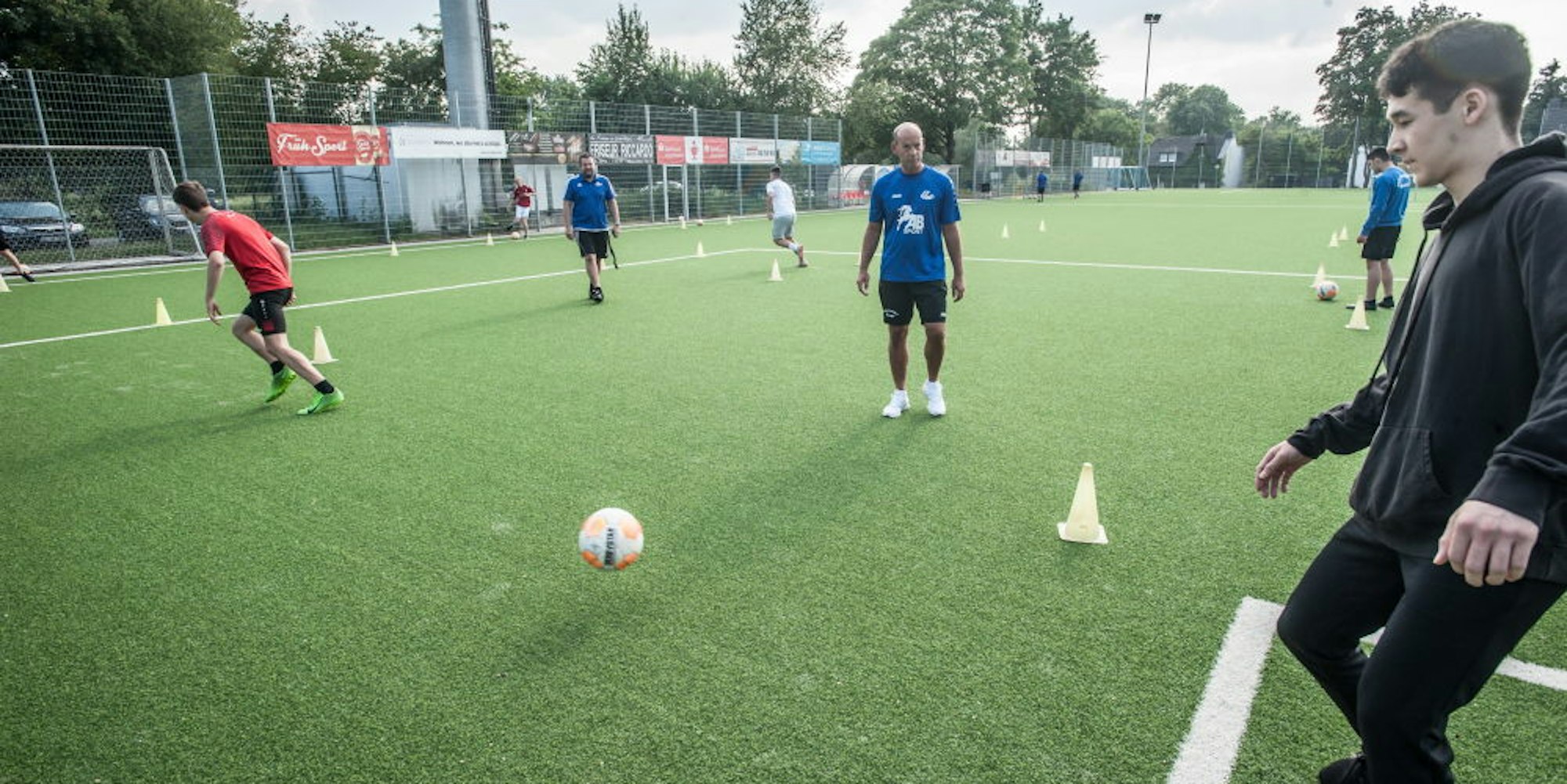 Denn wenn der Platz wieder geschlossen würde, wäre das schlimm, nicht nur sportlich. „Die Kondition der Jungs ist nach der langen Pause ziemlich am Boden. Und natürlich kann man mit zwei Metern Abstand kein vollwertiges Fußballtraining machen“, sagt B-Jugendtrainer Jörg Wexel. „Aber jetzt sind die Jungs endlich wieder von der Straße runter, sie haben was Vernünftiges zu tun, das ist wichtig.“ Den Kontakt haben die Trainer die ganze Zeit aufrecht erhalten, sie wissen um die soziale Bedeutung des Vereinslebens besonders in einem Stadtteil wie Alkenrath. Wexel und sein Kollege Daniel Albe wissen, welcher ihrer Jungs wann eine Abschlussprüfung schreibt und fragen bei der Fuß-zu-Fuß-Begrüßung nach, wie es gelaufen ist. Kurz vor Trainingsbeginn fehlt noch ein Jugendlcicher, Wexel checkt sein Handy, wer nicht kommt, muss sich abmelden. Aber da kommt der Gesuchte schon seelenruhig um die Ecke. „Ey – Punkt 18 Uhr, wie hast Du das hinbekommen?“, feixt Wexel. Doch kein Euro für die Mannschaftskasse.