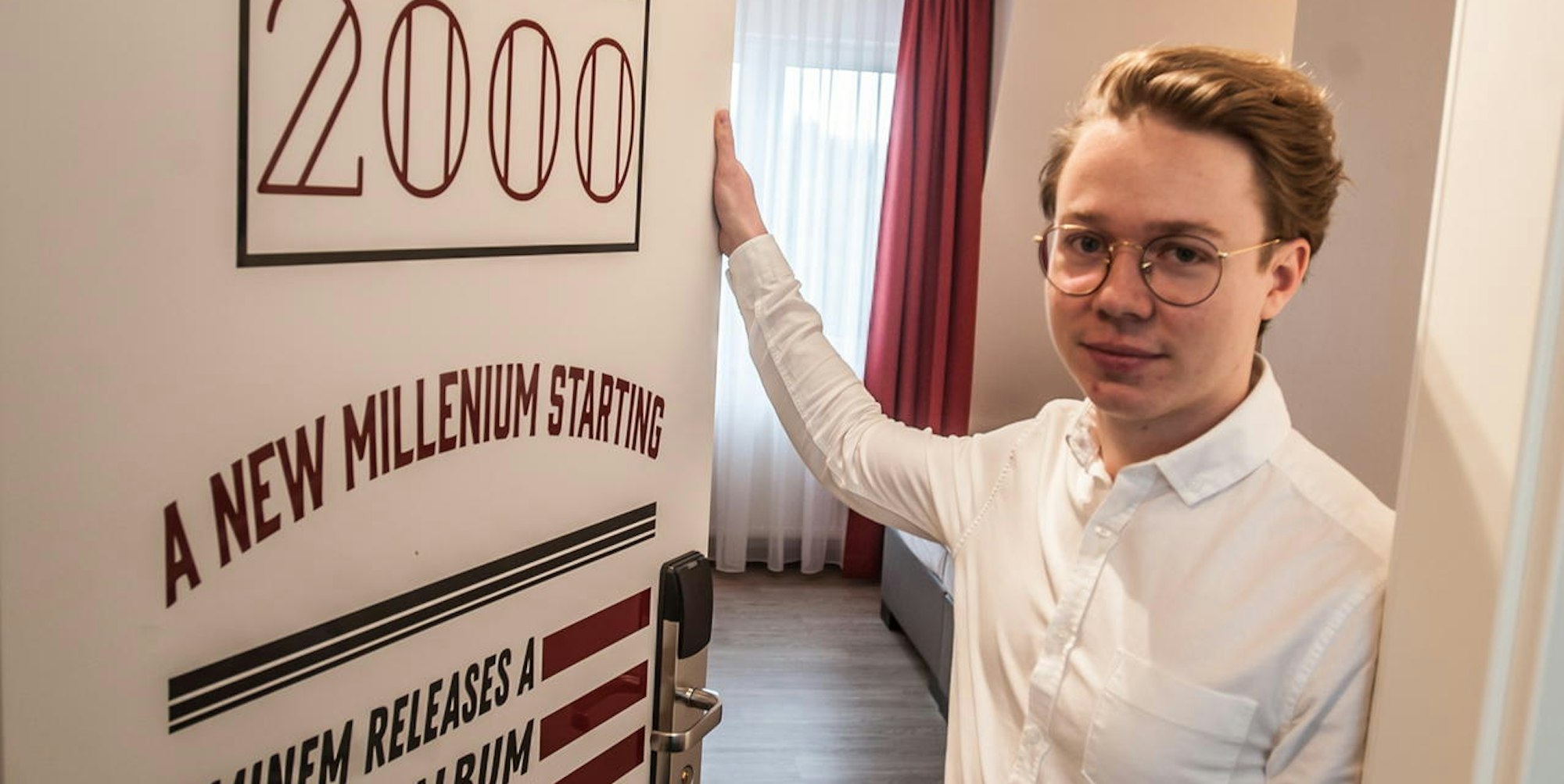 Cornel Müller vor dem Zimmer des Jahres 2000 – mit Historie an der Tür.