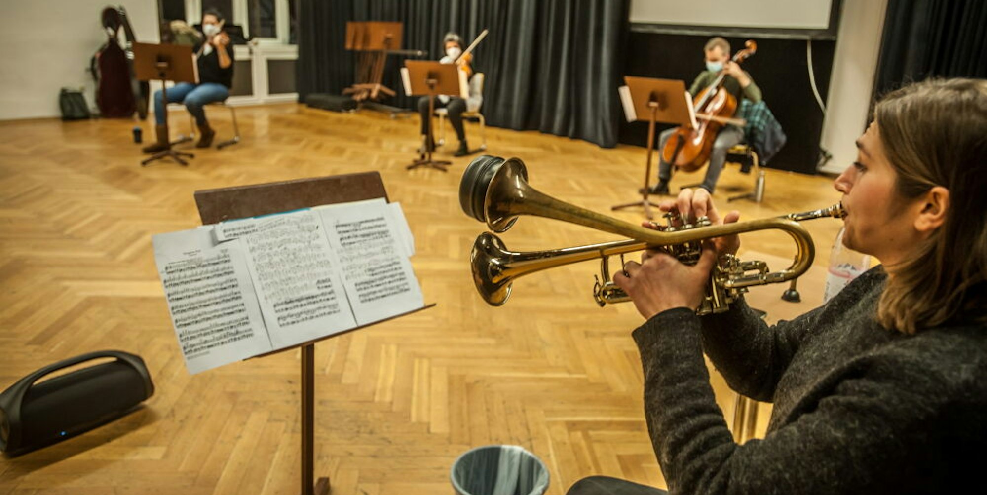 Zeitgenössische Musik trifft Barock: Die Trompeterin Rike Huy bei den Proben mit den Musikerinnen und Musikern von L’arte del Mondo im Erholungshaus.