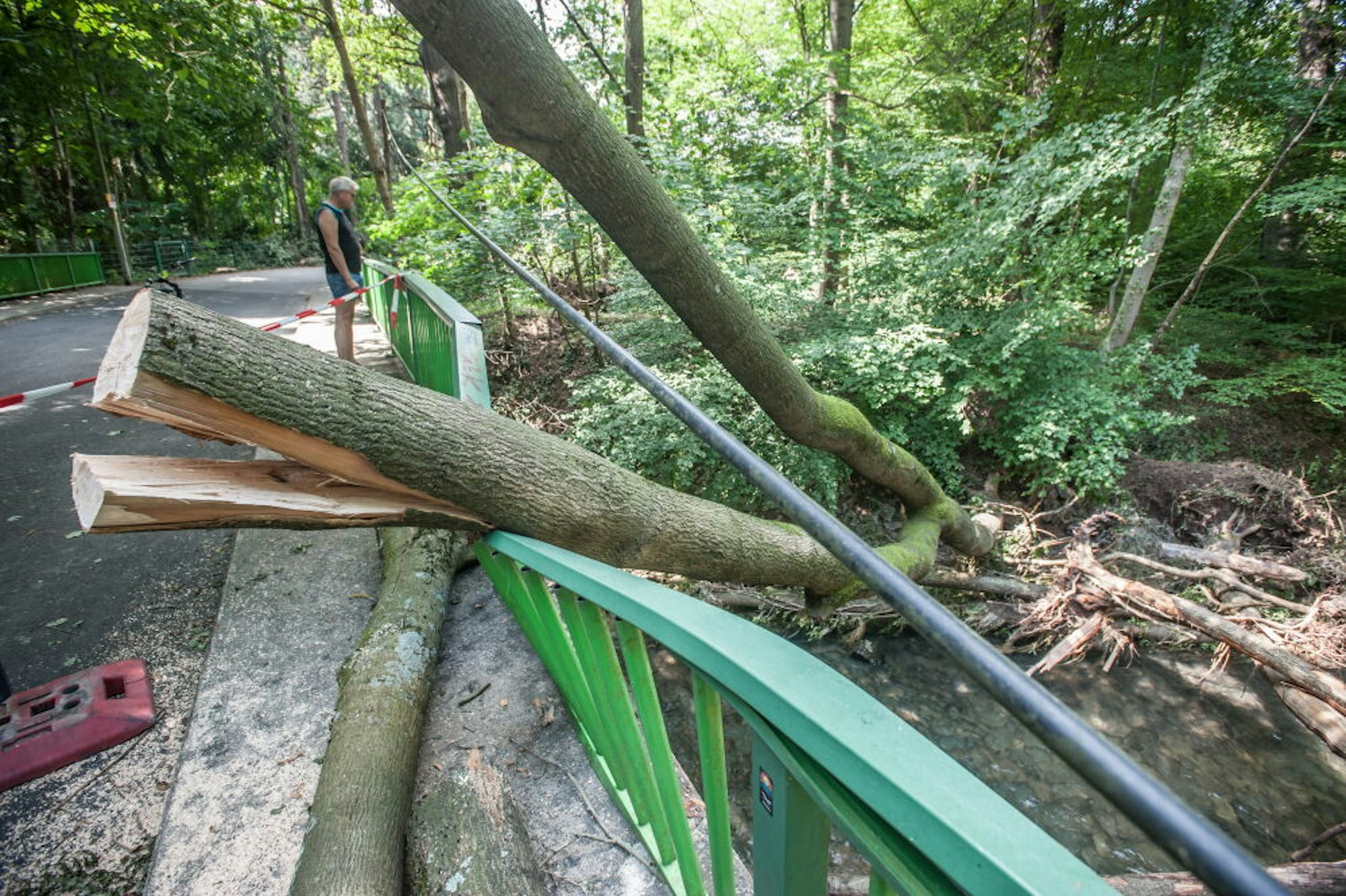 Von den Fluten der Dhünn mitgerissene Bäume haben der ohnehin maroden Brücke am Hammerweg weiter schwer zugesetzt.