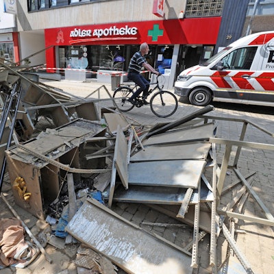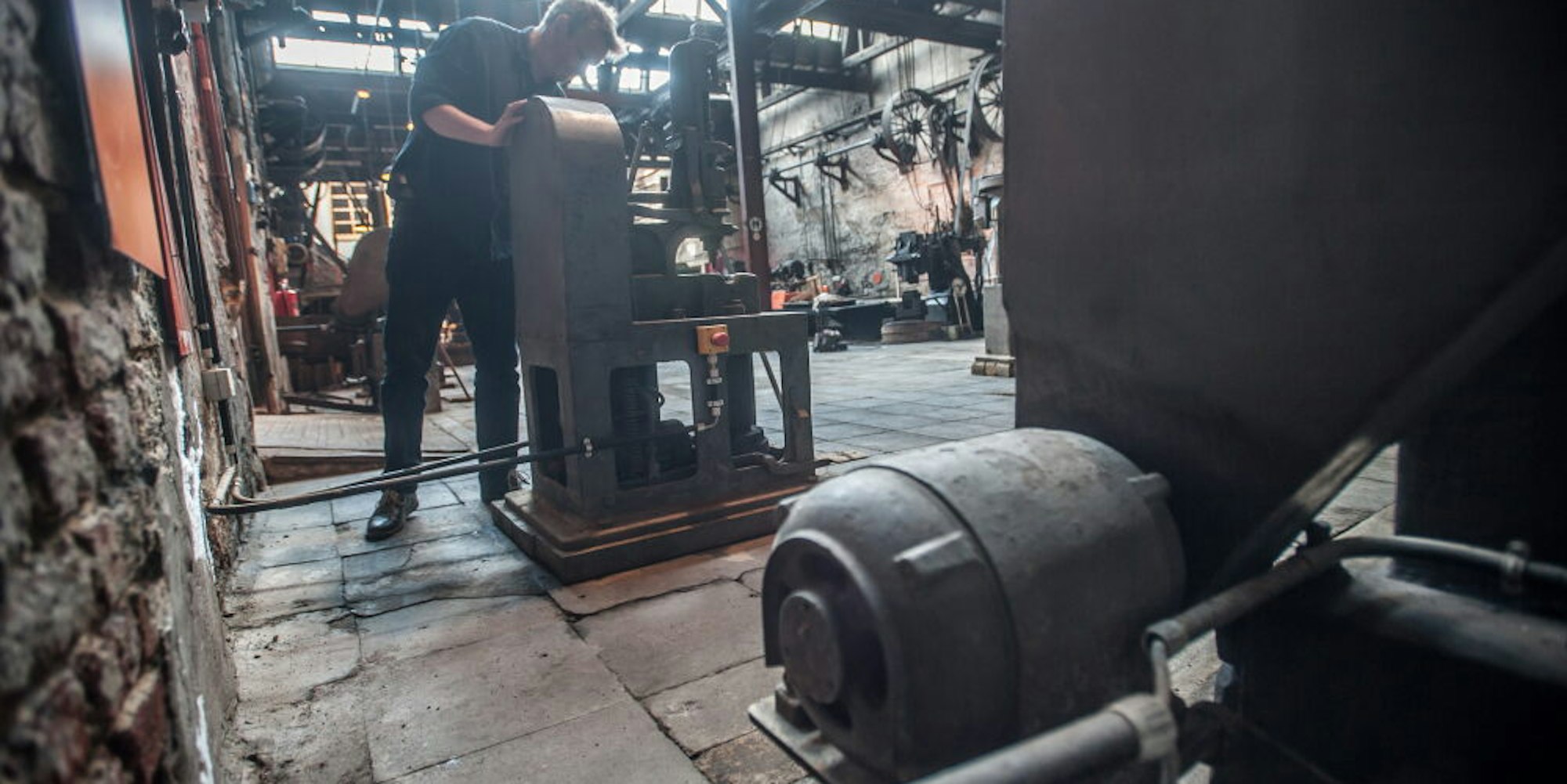 Leverkusen – In der großen Schmiedehalle des Freudenthaler Sensenhammer stand das Wasser schnell sehr hoch. „Es ist aber zum Glück auch schnell wieder abgeflossen“, sagt Jürgen Bandsom, Leiter des Industriemuseums. Der Grund ist eine Turbine unter der ehemaligen Sensenfabrik, durch die das Dhünnwasser früher floss. „Das hat dann schnell hochgedrückt. Dadurch, dass wir den Ablauf noch haben, ist es aber auch abgeflossen, ohne, dass wir pumpen mussten.“ Eine Schlammschicht hat das Wasser dennoch zurückgelassen, die haben fleißige Helfer aber schnell beseitigt. Sichtbar wurde dann: Die Bühne ist aufgeschwemmt und muss abgebaut werden. Die historischen Maschinen sehen auf den ersten Blick aber gut erhalten aus.