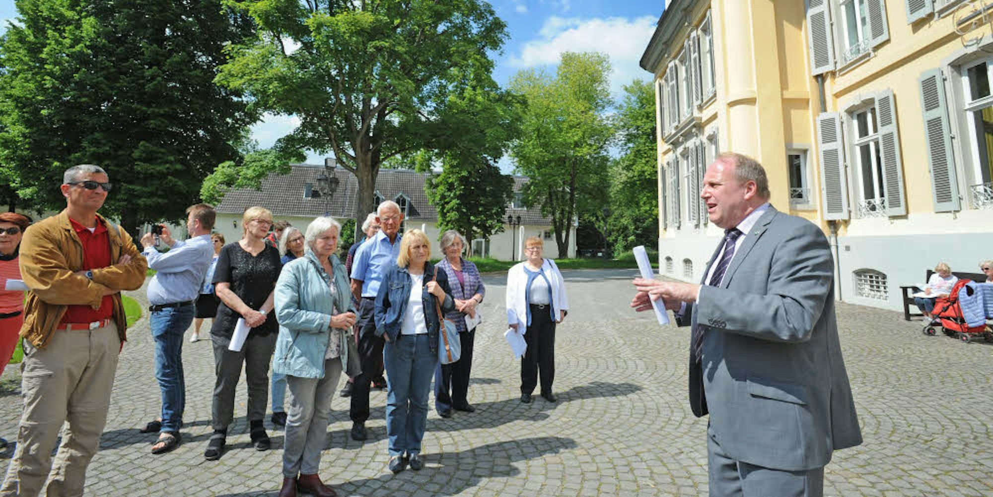 Michael Gutbier (r) weiht die Teilnehmer in die Geschichte von Schloss Morsbroich ein, die bis 1329 zurückreicht.