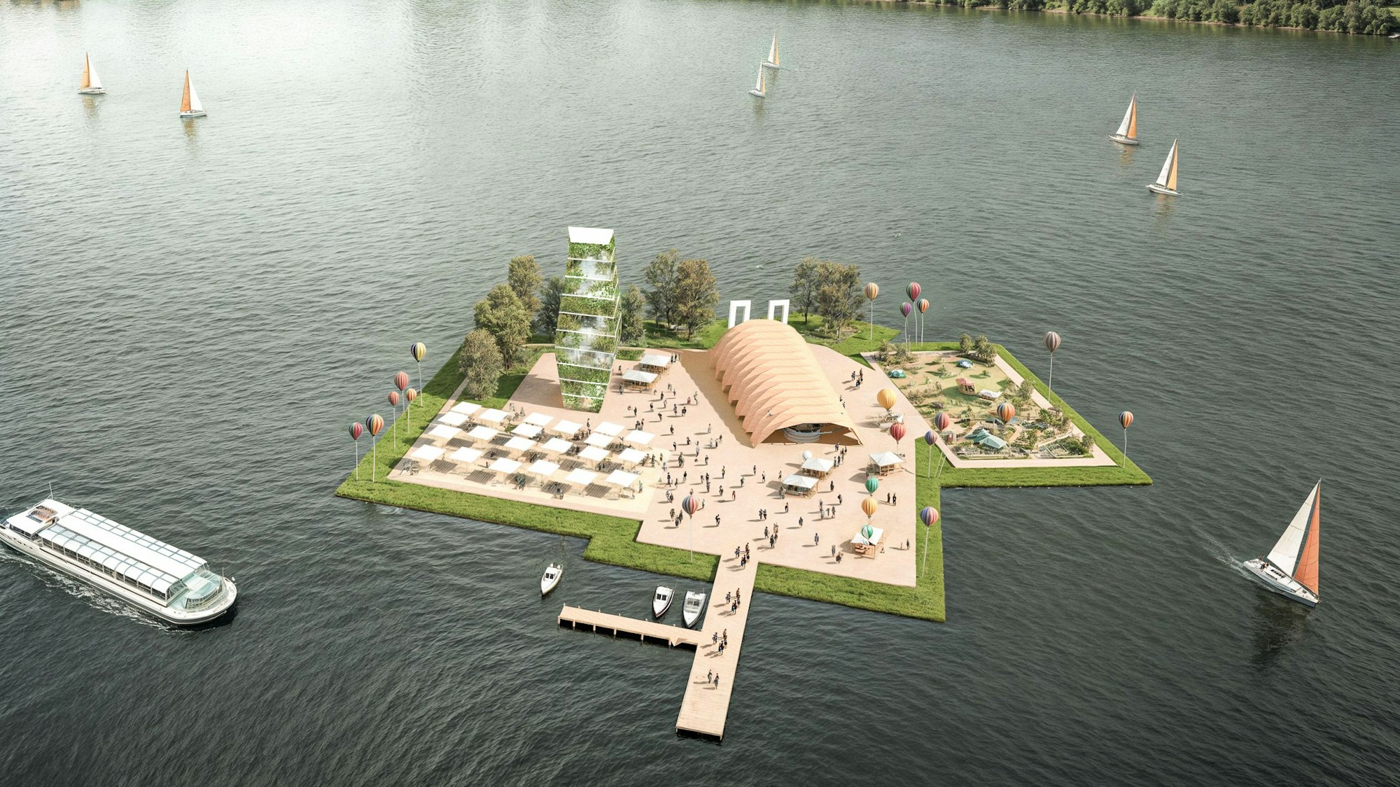 Eine künstliche Insel ist Hauptattraktion des künftigen Sees in Garzweiler. Der Masterplan für die Zeit nach dem Tagebau wurde nun verabschiedet. Illustration: RHA
