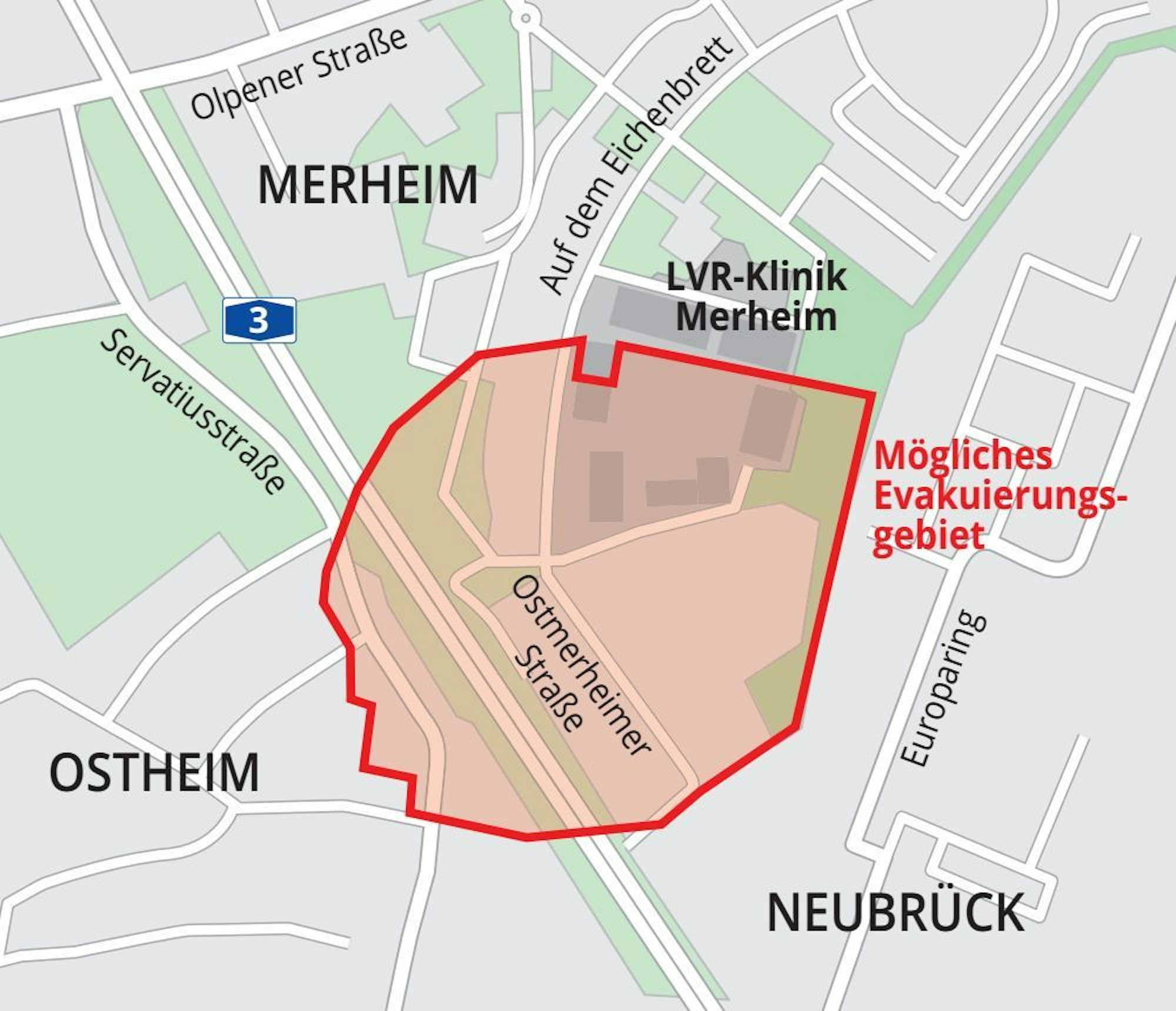 Vom Fall der notwendigen Entschärfung sind neben 600 Anwohnern, die ihre Häuser in der Servatiusstraße in Köln-Ostheim verlassen müssten, die LVR-Klinik Köln-Merheim und ein Teilbereich der RehaNova-Klinik auf dem Gelände der Kliniken der Stadt Köln betroffen. Während die RehaNova nur rund 60 Patienten hausintern in einen anderen Gebäudeteil sowie in das Krankenhaus Merheim verlegen müsste, wäre die LVR-Klinik komplett zu räumen. Laut Presseamt stehen Personal, Transportkapazitäten und Aufnahmeeinrichtungen für die rund 460 Patientinnen und Patienten zur Verfügung. Massiv eingeschränkt sind in dem Fall Parkplätze und Zugangsmöglichkeiten.