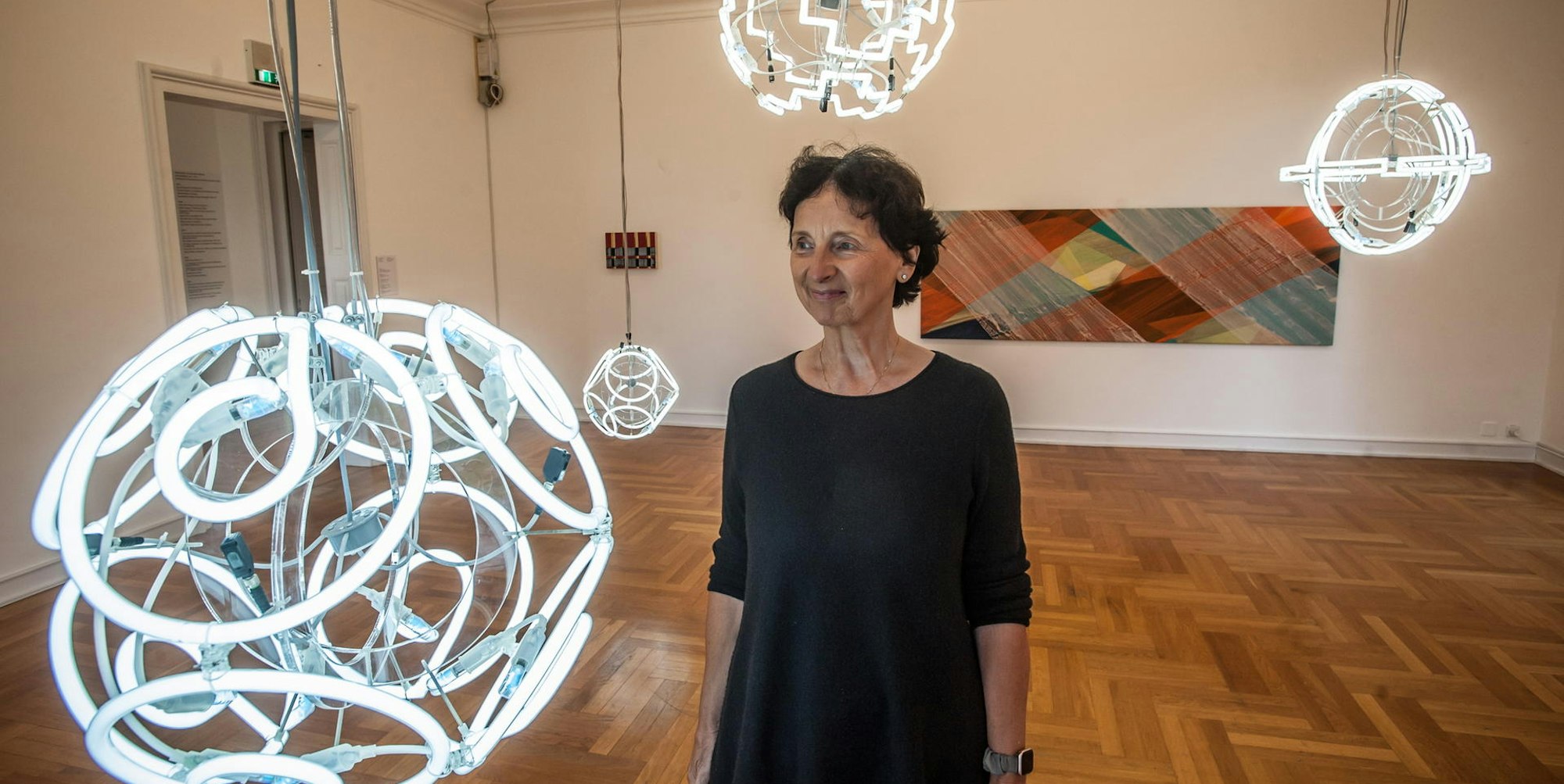 Glückliche Kuratorin auf Zeit: Alice Steinbach aus dem Museumsshop in „ihrem“ Raum mit der Jeppe-Hein-Leuchtskulptur.