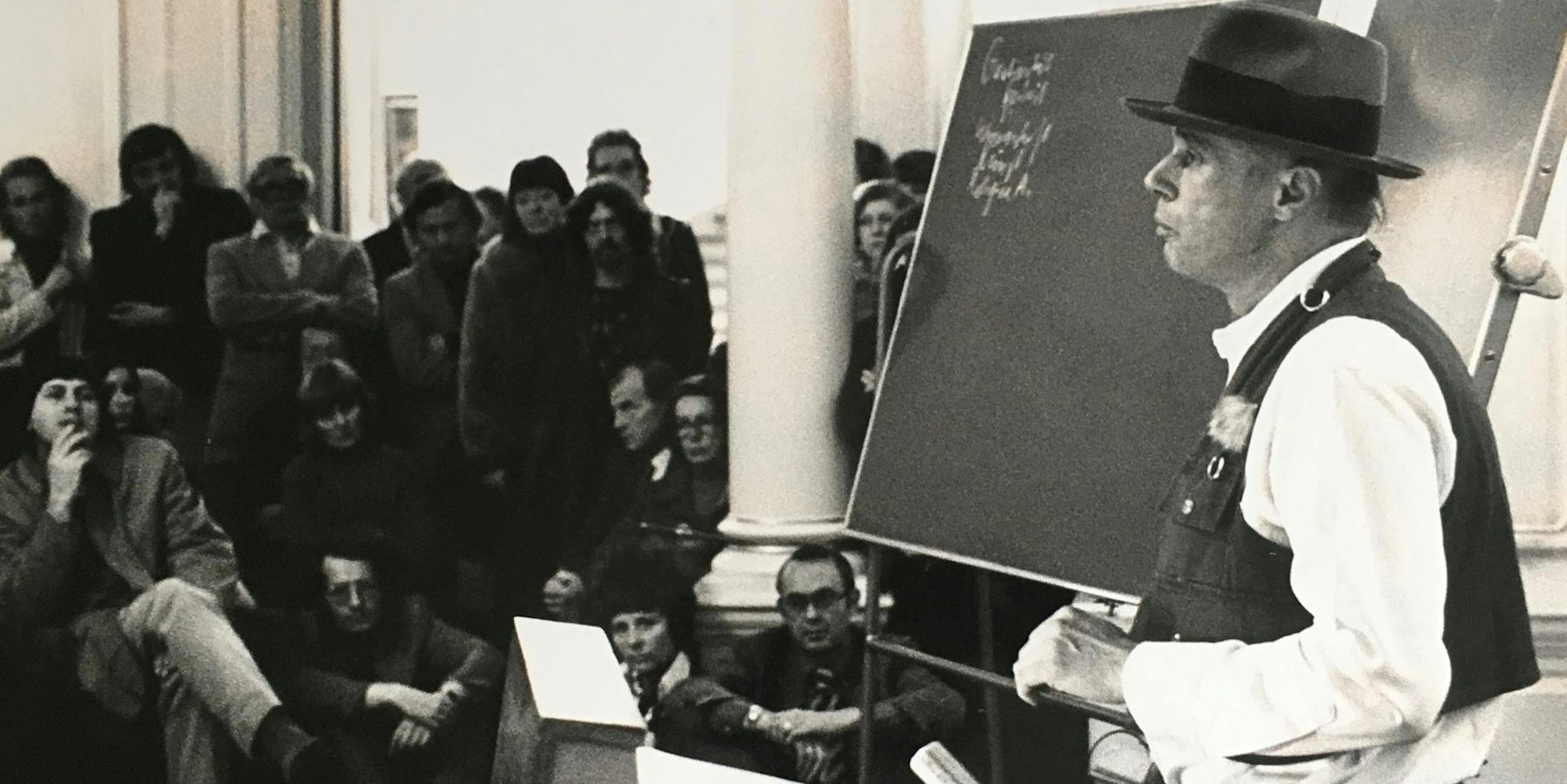 Der Vortrag begann. Beuys referierte und dozierte vor zahlreichen Besucherinnen und Besuchern. Und am Ende sollte die Tafel dann wieder zurückgebracht werden in die Schule. Abgewischt mit einem Schwamm. Das sei jedenfalls der Plan gewesen, betont Ursula Wedewer, die auf Holger Schmitts Foto zu sehen ist, wie sie gemeinsam mit ihrem Mann neben der angesprochenen Tafel auf dem Boden sitzt.
