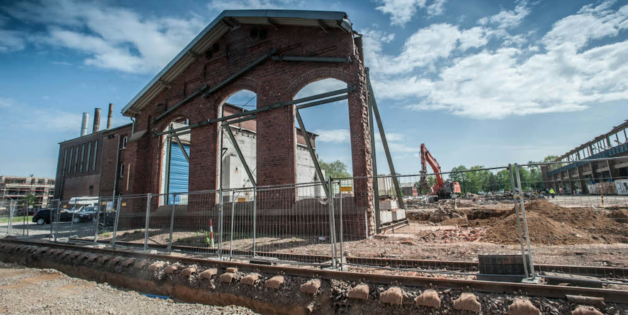Nur Fassadenteile der früheren Werkhallen des Bahn-Ausbesserungswerks bleiben bestehen.