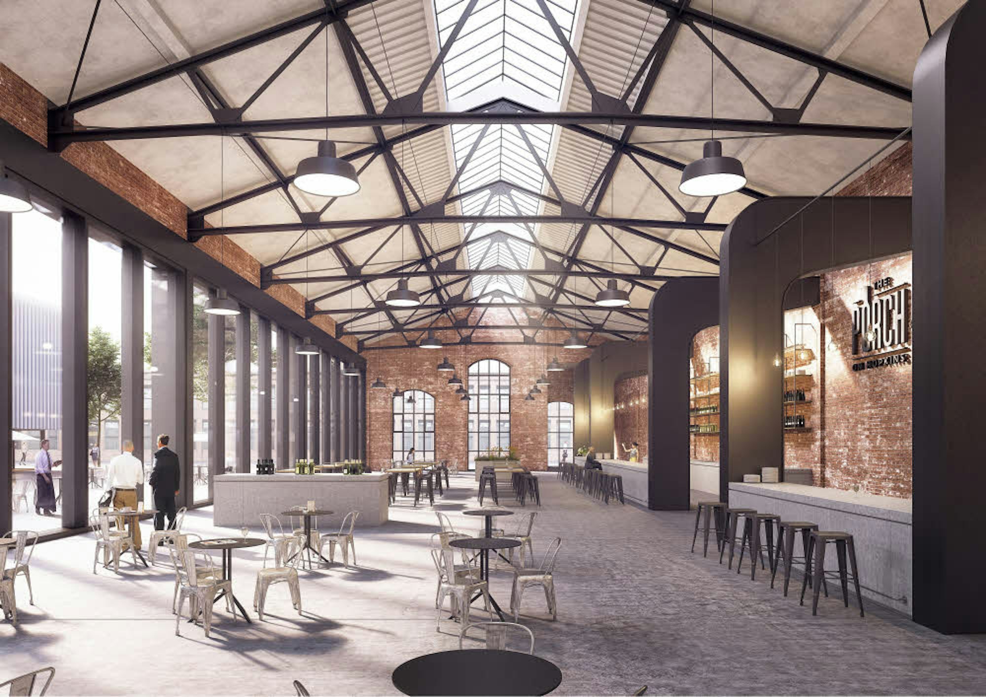 Die alte E-Lok-Werkstatt soll einen Gastronomie-Betrieb aufnehmen, der sich zu einem Innenhof hin öffnet.