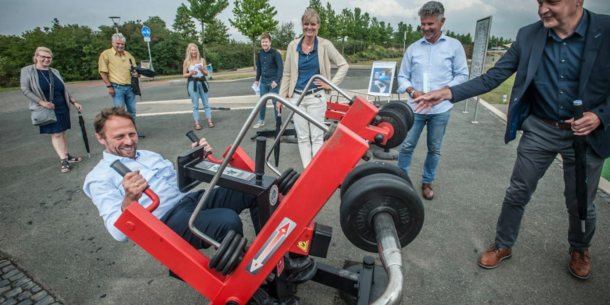 OB Uwe Richrath probierte eins der neuen Geräte des Neuland-Gym direkt aus.