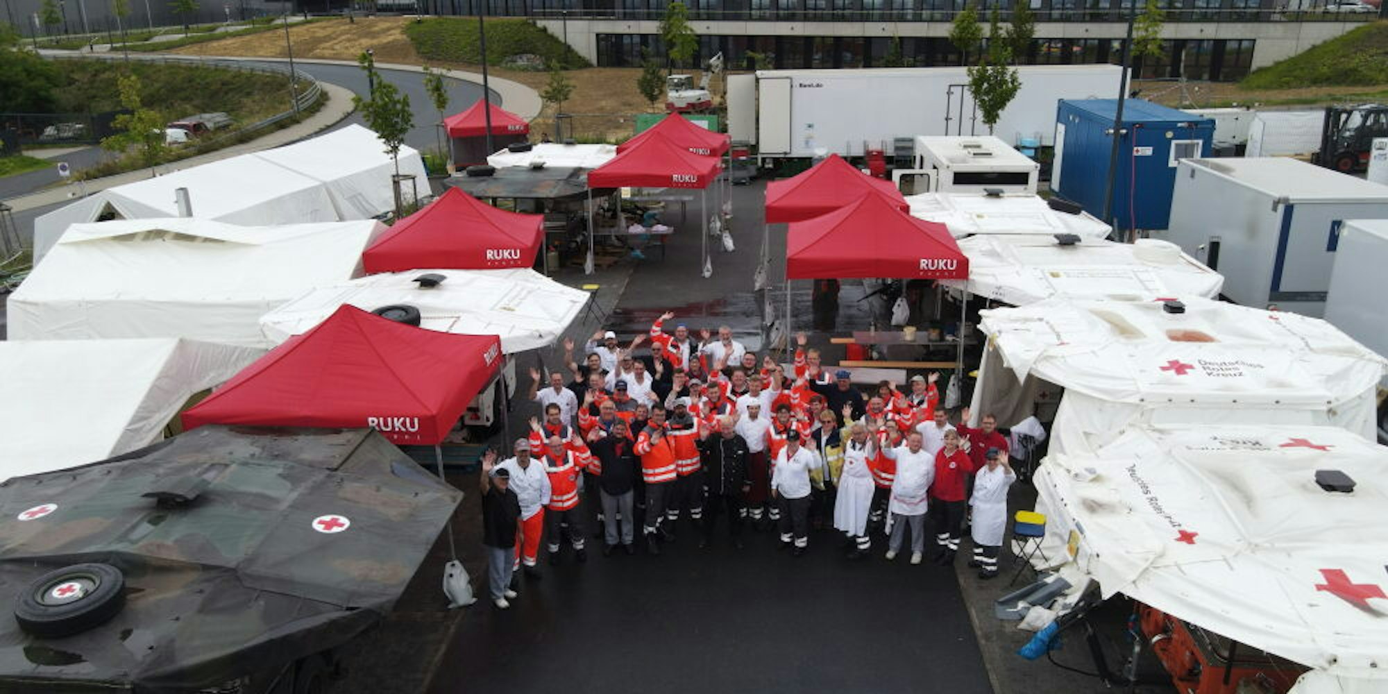 Dort war eine kleine Zeltstadt aufgebaut mit zwölf Feldküchen und allem, was sonst noch gebraucht wird: Spülstraße, Waschmaschinen, Trockner, Dusch- und Toilettencontainer, Ruhezelt und und und. „Logistisch war das schon eine Leistung“, berichtet Schmidt: „Zusätzliche Wasserleitungen wurden verlegt und ein eigenes Abflusssystem für die Küchen geschaffen, es gab diverse Notstromaggregate und Kühlanhänger.“