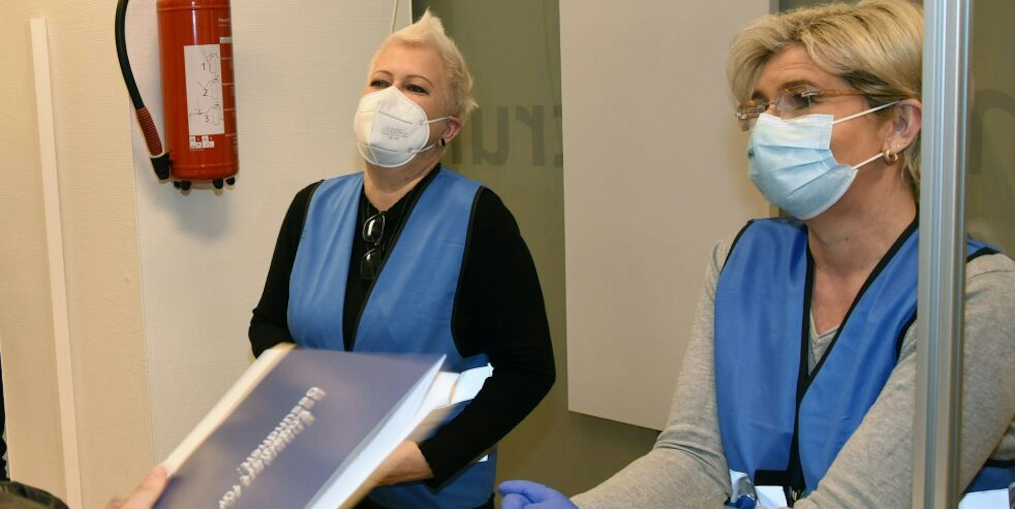 Martina Bilstein (l.) und Manuela Löwe überprüfen im Impfzentrum die Impfberechtigungen.