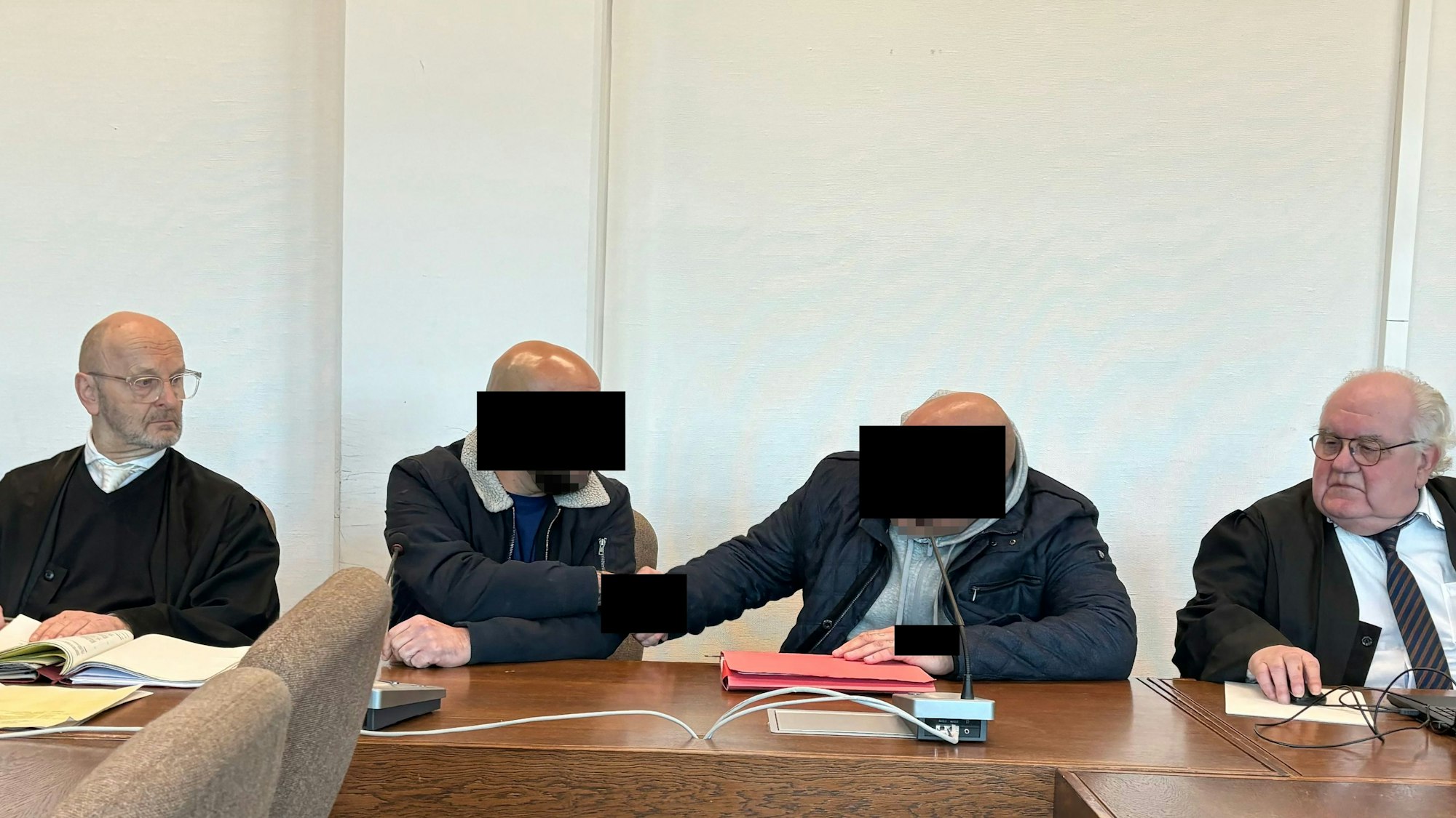 Zwei Beschuldigte (M.) von vermutlich vier bis fünf Tätern sitzen seit Dienstag auf der Anklagebank.