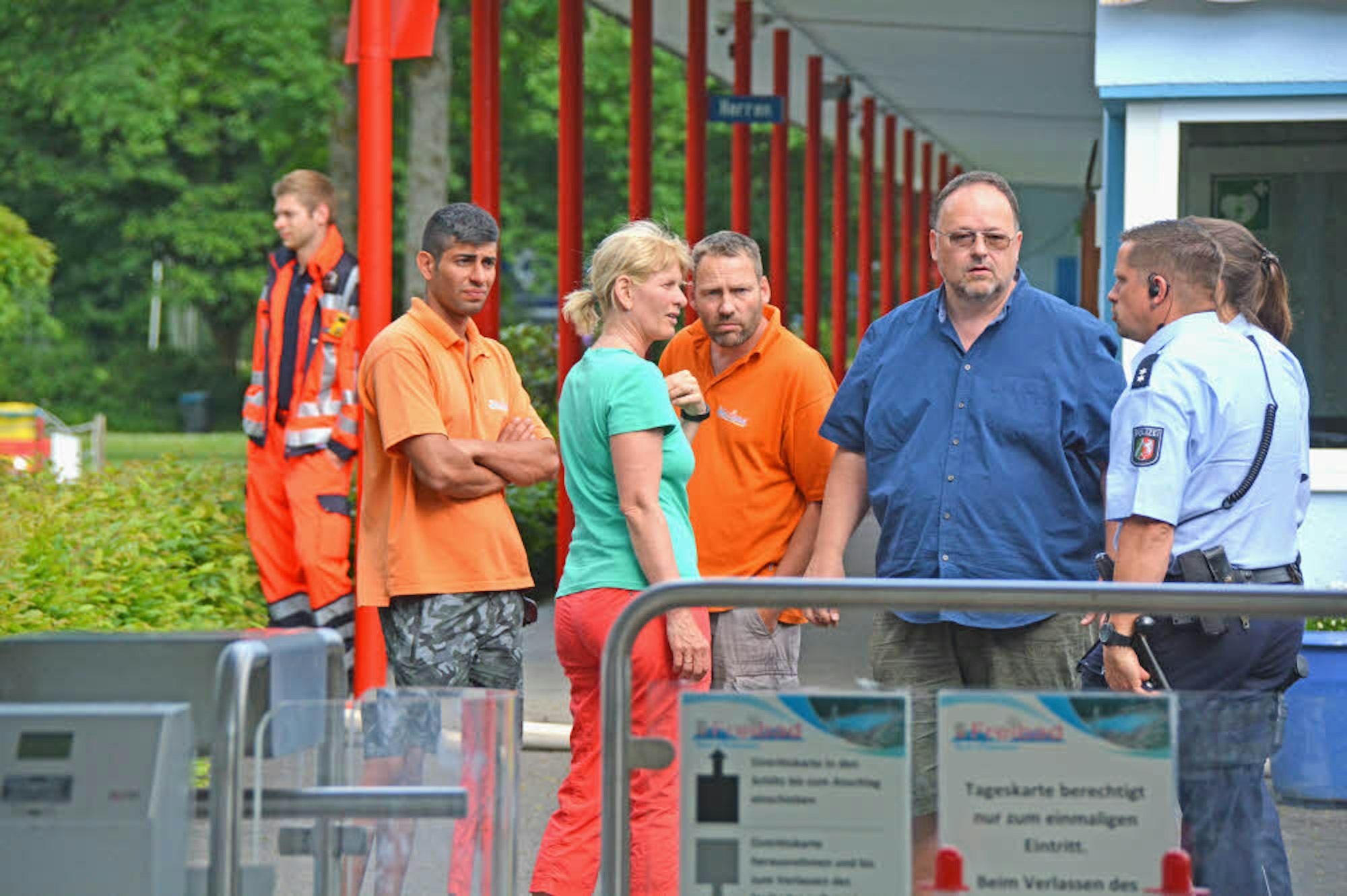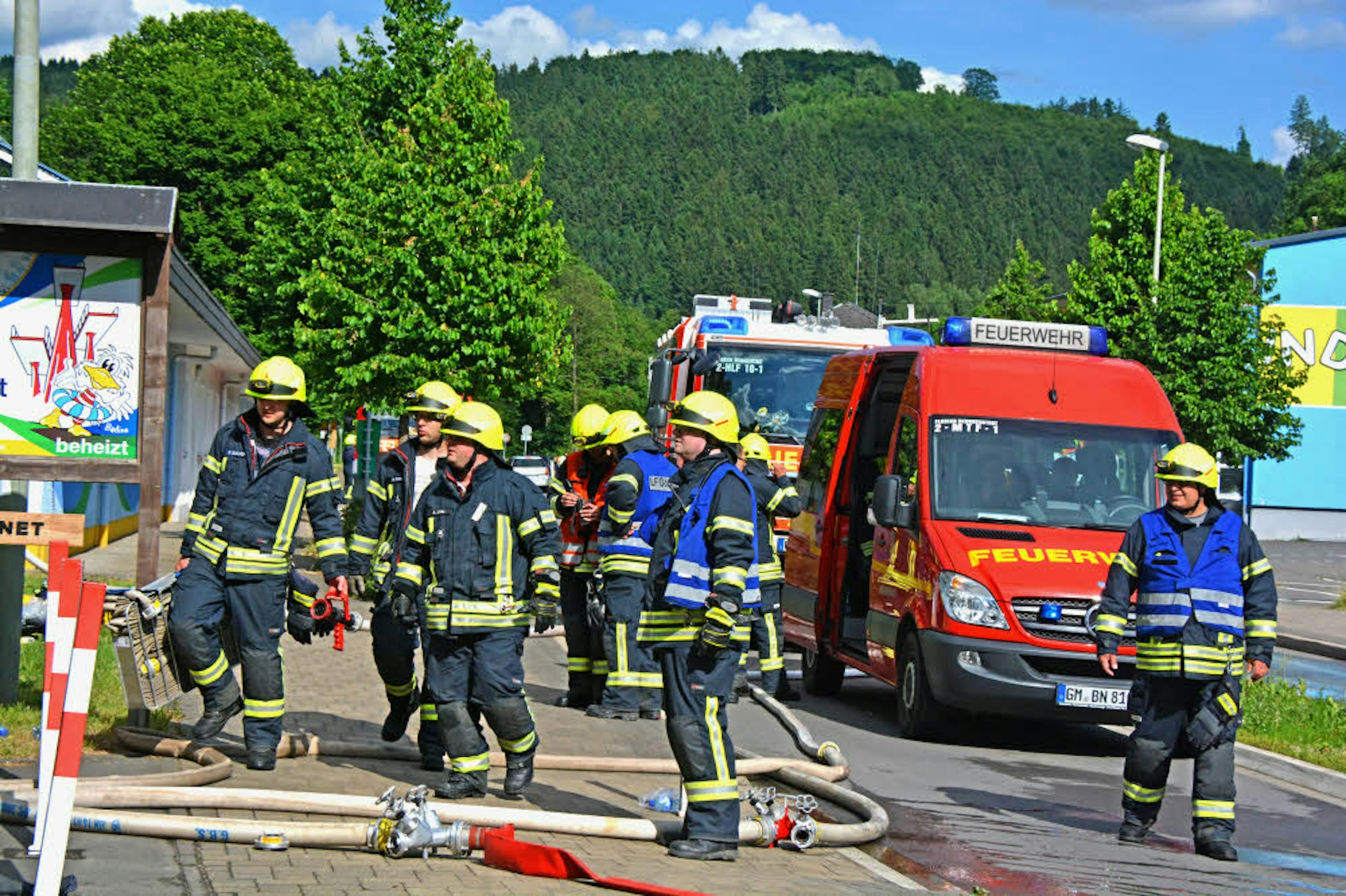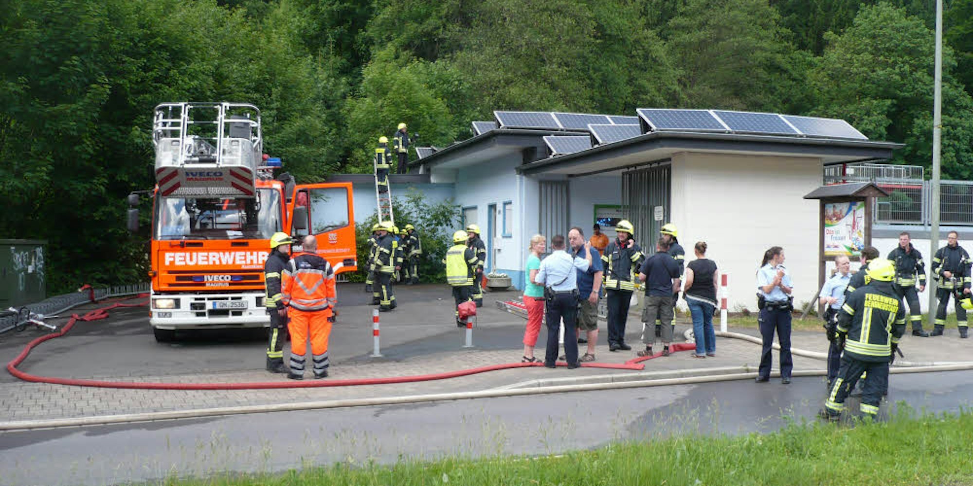 Die Feuerwehr war mit drei Löschzügen im Einsatz, bereits auf der Anfahrt hatte Stadtbrandinspektor Michael Stricker die Alarmstufe hochgesetzt und mehr Kräfte angefordert. Zum Zeitpunkt des Feuers waren noch zwischen 40 und 50 Gäste im Bad.