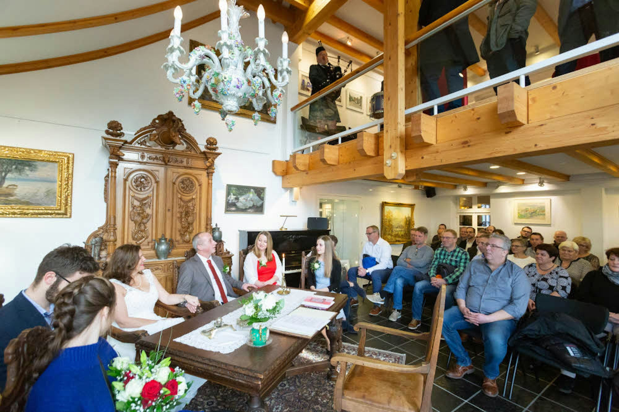 Brautleute und Gäste sitzen sich im Trauzimmer gegenüber. Wem es im Erdgeschoss zu eng ist, der schaut von der Empore zu.