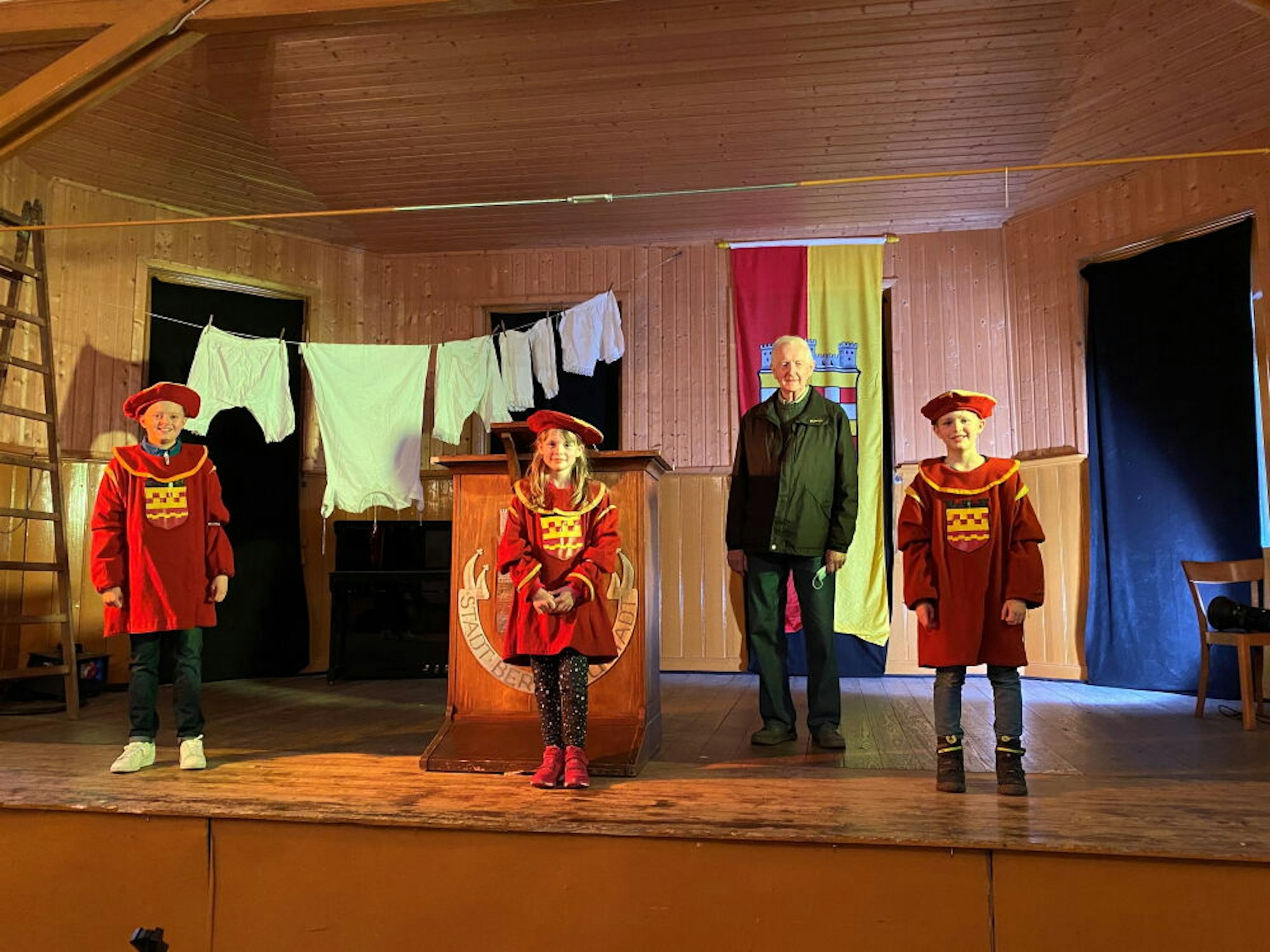 Gedreht wurde – natürlich – in der Altstadt, wo drei Kinder auf der Suche nach der Stadtgeburtstagsfeier sind. Mehr will Walter Jordan noch nicht verraten, nur so viel noch: Gefilmt wurden die einzelnen Programmpunkte auf der Bühne im Jägerhof – stilecht vor der Bergneustadtfahne und der Wäscheleine mit ollen Liebetötern als Dekoration. Von der Bühne aus werden auch die beiden Nyestädter Originale Karl von der Dörspe und Minchen die Zuschauer mit einem herzlichen „Leiwe Niijestätter, chunn Daach tesaamen!“ begrüßen, um dann wie weiland die Waschweiber am Losemundbrunnen auf Platt die dreckige Wäsche der Stadt und der Stadtoberen ausbreiten.