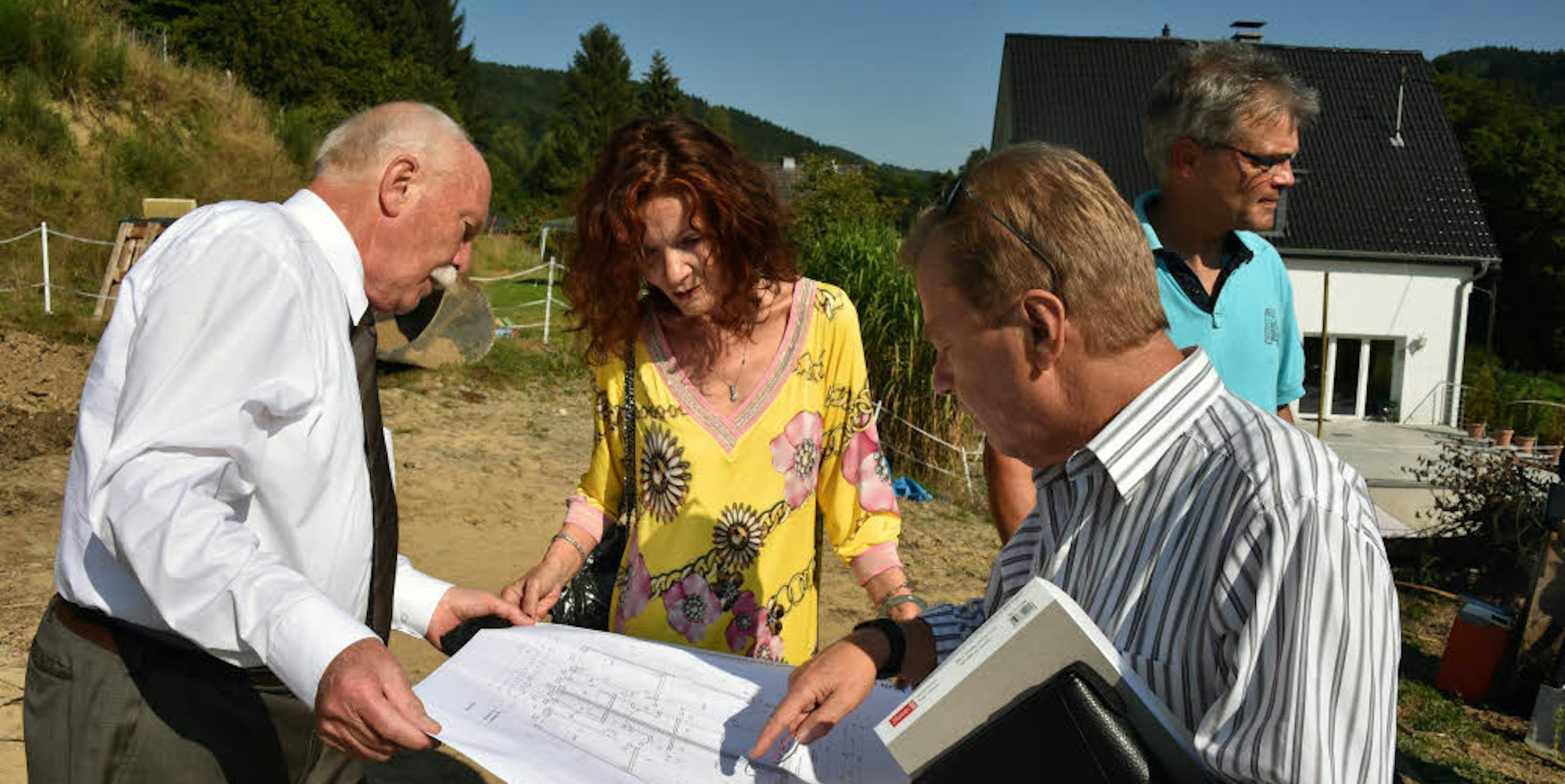 Reinhard Zeppenfeld (80, l.), seine Frau Marcy und Architekt Bernhard Schölzel mit den Plänen auf dem Baugrundstück.