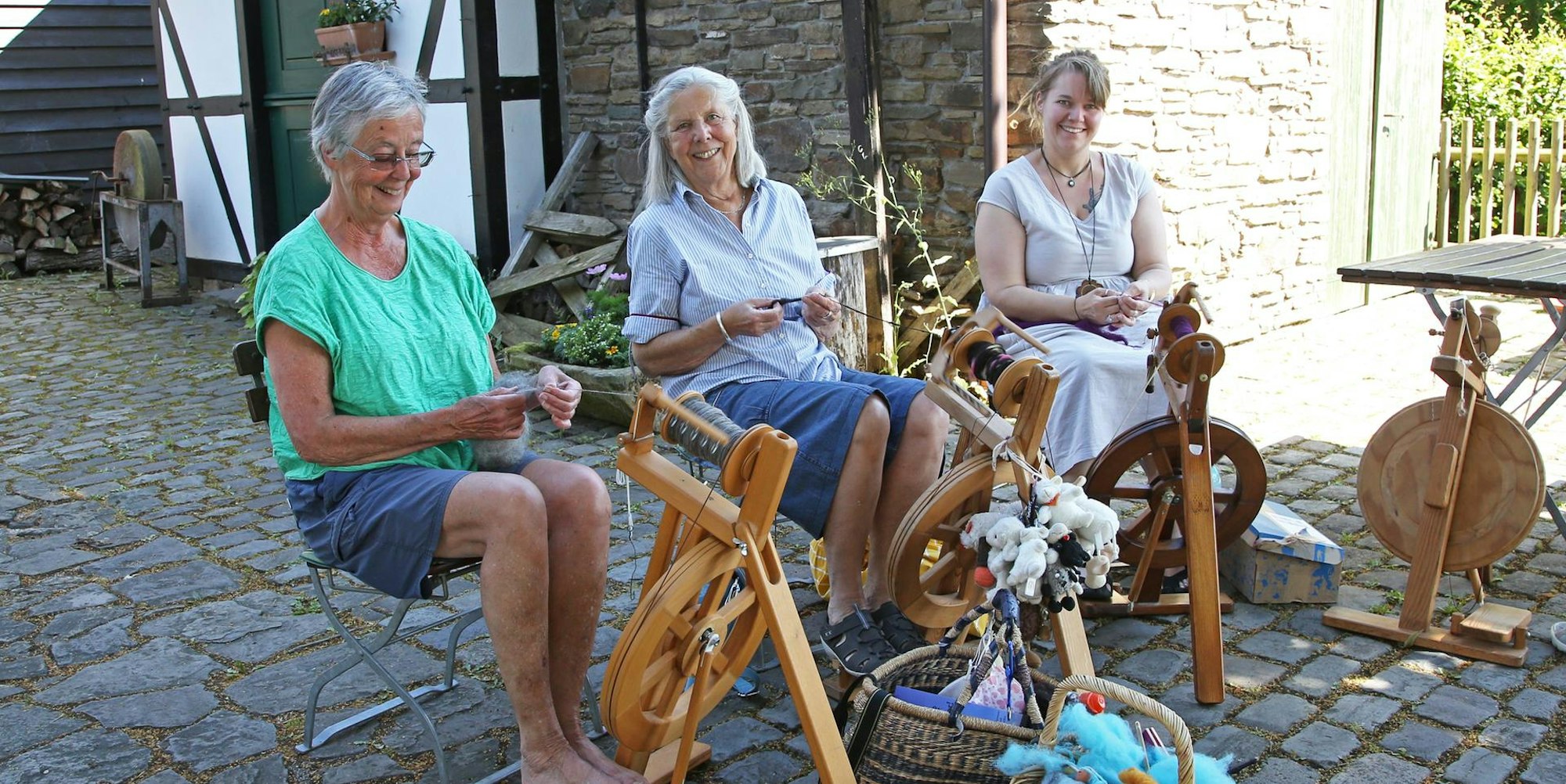 Im Sommer sitzen Helina Keller (M.) und ihre Spinnerinnen beschattet von grünen Blättern neben dem alten Fachwerkhaus, lassen ihre Spinnräder Fahrt aufnehmen und plaudern.