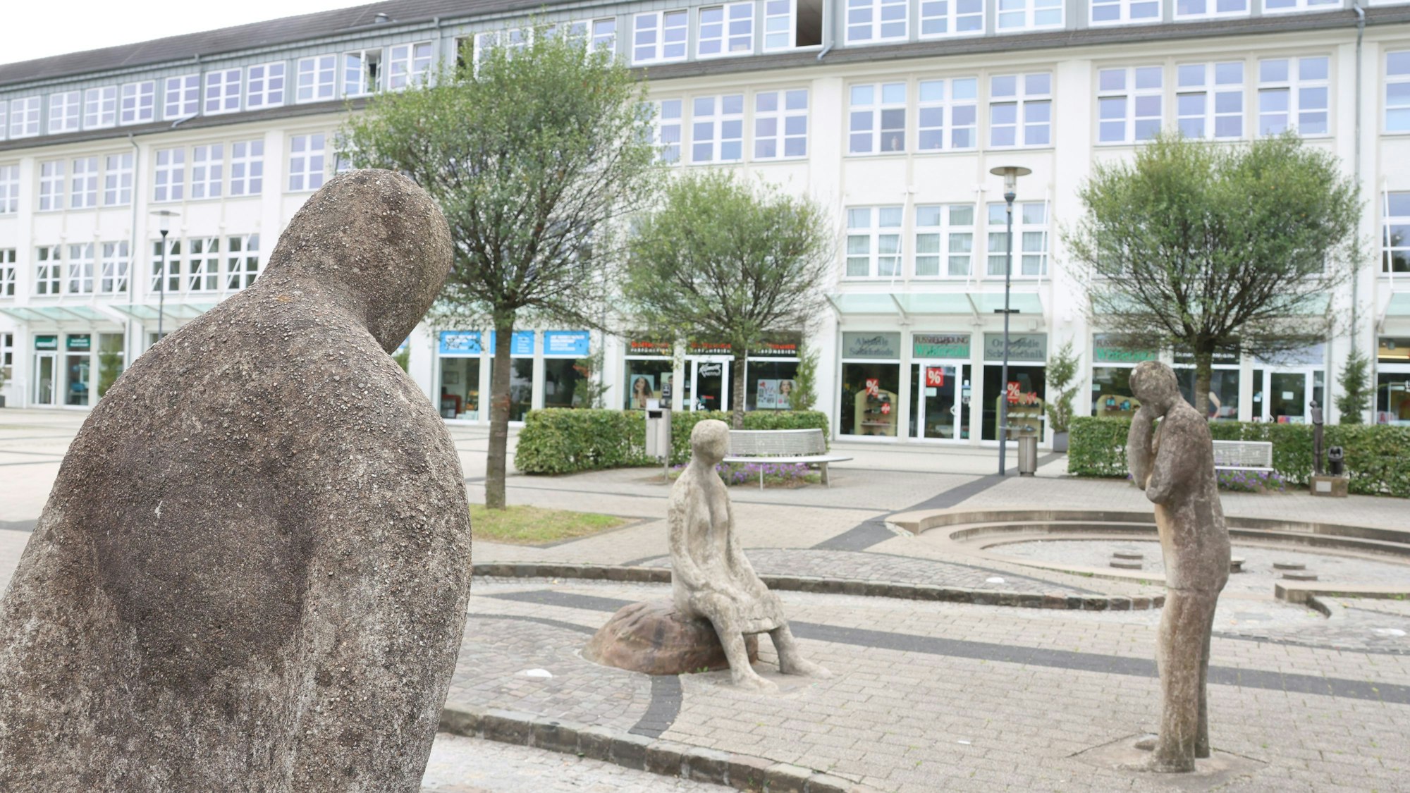 F - Fotos Bergneustadt, Skulpturengruppe Austausch, Argwohn und Gelassenheit von Monika Schüchter vor dem Rathaus *** Aufnahmezeit: 08.08.2025 13:55:12 *** Honorar-Nr.: 17556