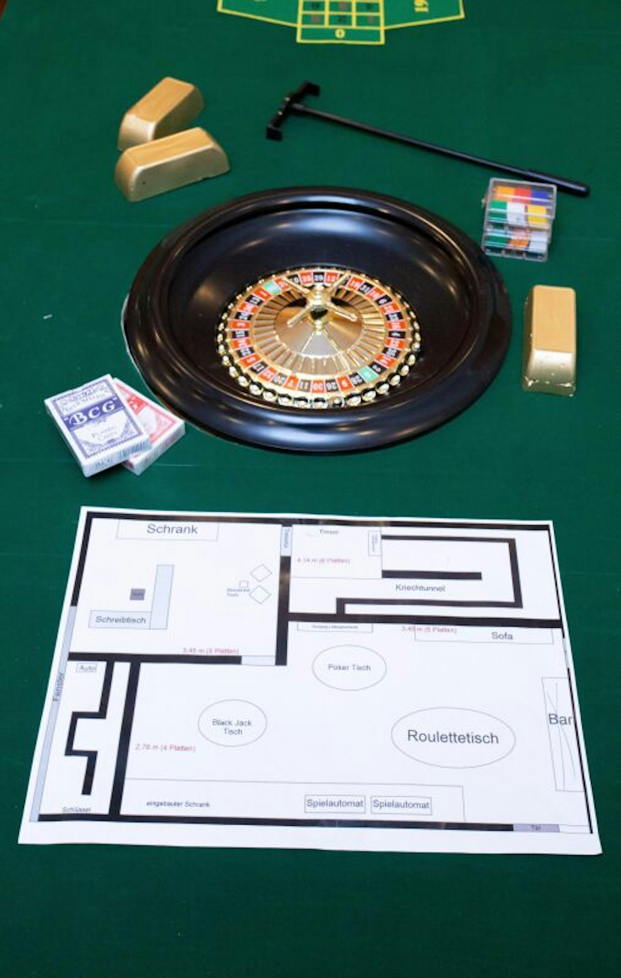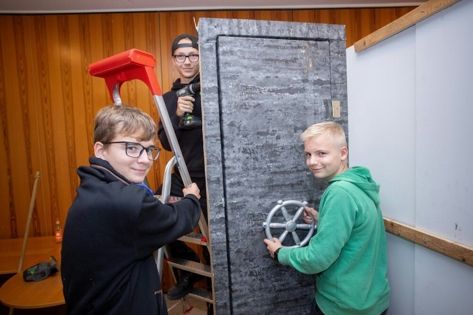 Schütz und Team zimmern derzeit noch Wände, streichen Flächen, bauen Möbel auf – alles gemäß zuvor gezeichneter Pläne. Nis-Hanjo (16), Jonas (13) und David (14) bauen einen Kriechtunnel zusammen, der als Ausweg aus dem Casino dienen soll. Ben (14) und Eliyah (13) lagern aus Gips gegossene Goldbarren auf dem selbstgebauten Roulettetisch.