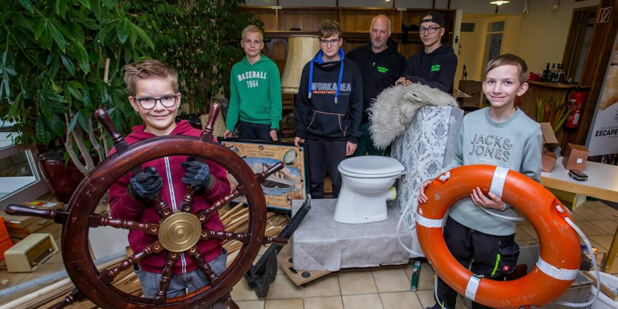 Das gleicht noch einer Baustelle: Zwischen Latten, Spanplatten und Werkzeugen liegen allerlei Requisiten. Steuerrad, Anker und eine Kloschüssel etwa warten noch darauf, an den richtigen Platz zu kommen. Spätestens am Freitag muss alles fertig sein, denn am nächsten Morgen soll der „Escape-Room“ für die ersten Besucher öffnen.