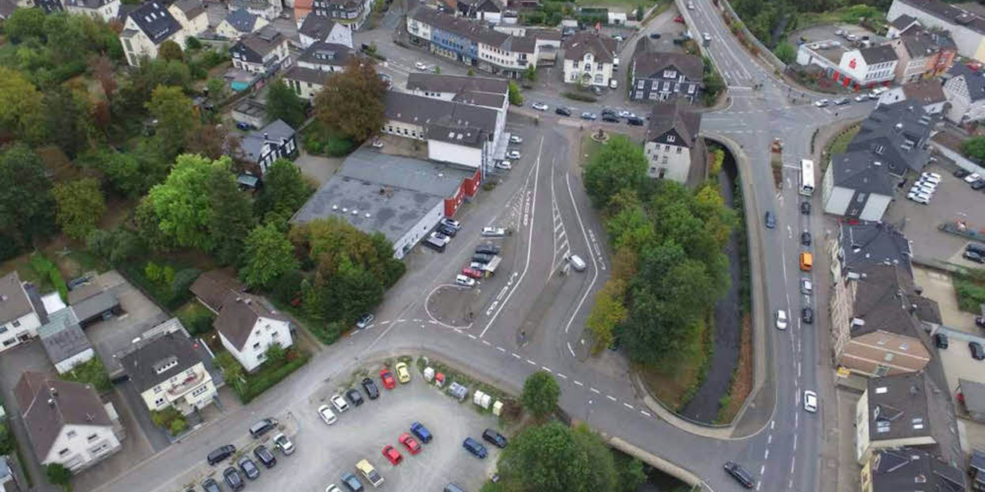 Mit Ampeln an der Klosterstraße (u.r.), an der Hauptkreuzung (o.r.) und an der Eckenhagener Straße (o.l.) soll der Umleitungsverkehr in Derschlag halbwegs flüssig laufen.