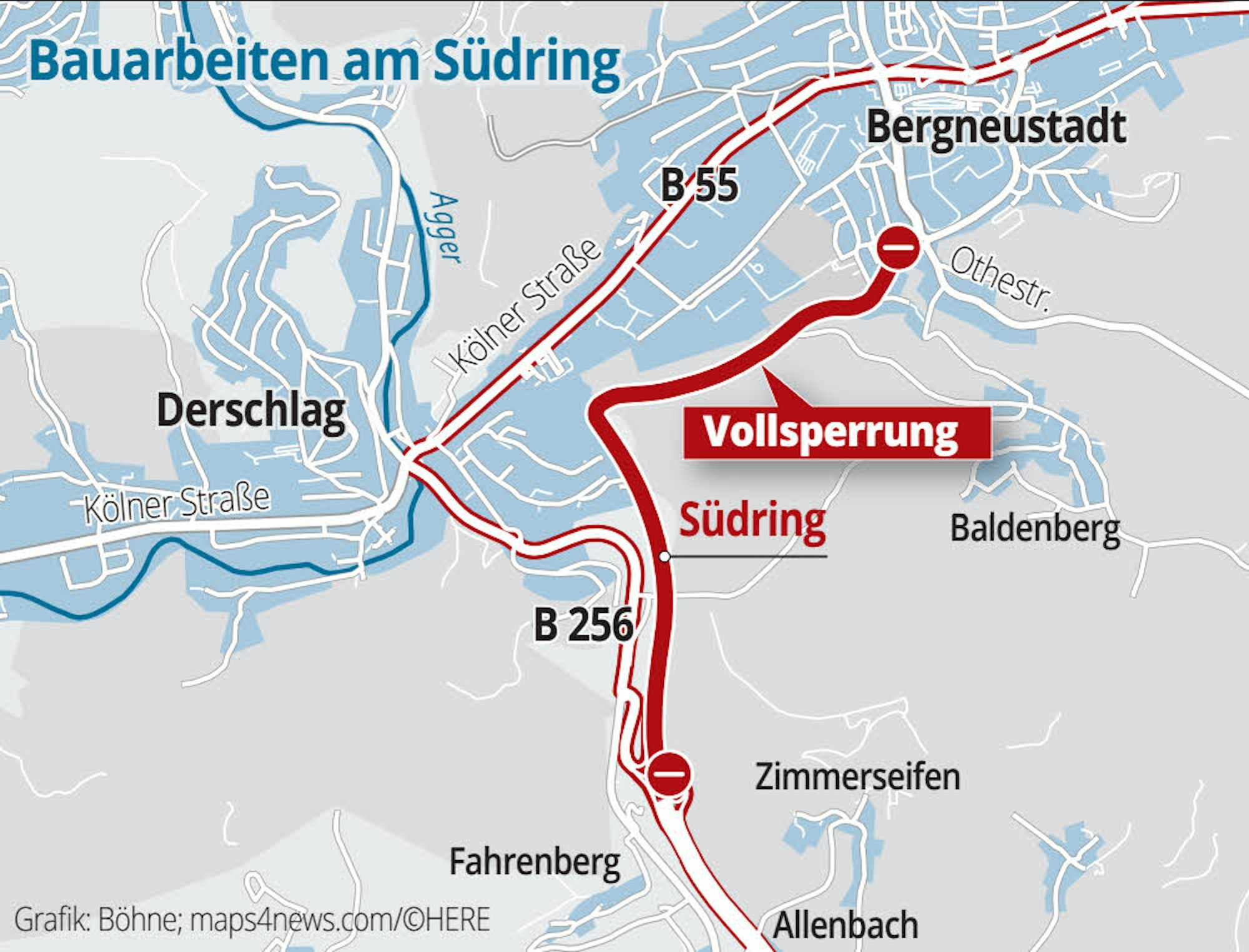In Bergneustadt wird es eine Umleitung von der Othestraße aus über die Friedhofs- und die Enneststraße bis auf den Südring geben. Von dort bis zum Abzweig Baldenberg wird eine einspurige Fahrtmöglichkeit ausschließlich für Pkw und Rettungsdienste Richtung Baldenberg ermöglicht. In der Gegenrichtung ist die Fahrt an der Baustelle vorbei nicht möglich.