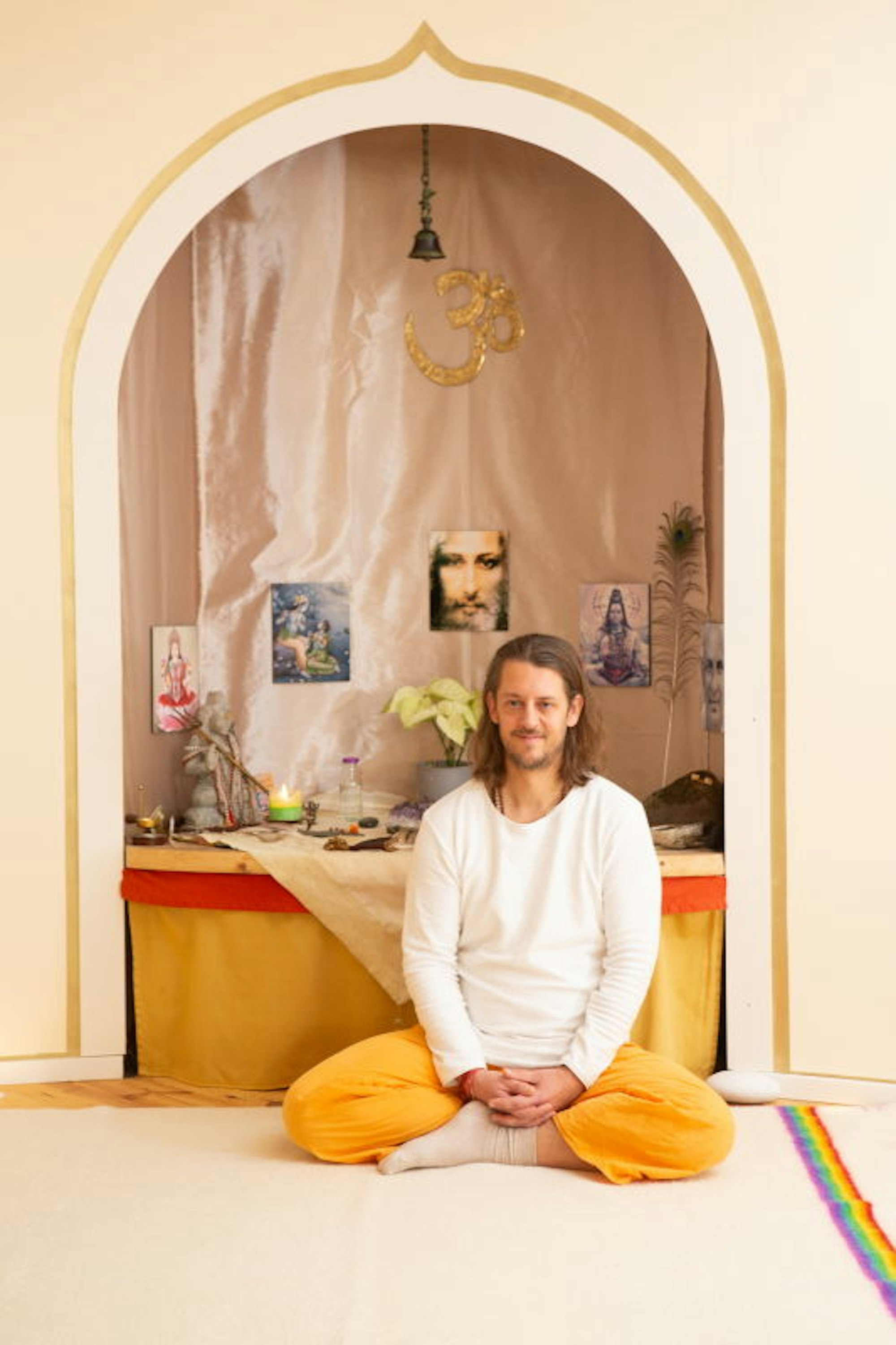 Schamane Schnepp sitzt wenige Tage vor dem Fest im Yogaraum in der Gummersbacher Fußgängerzone mit einem violetten Meditationskissen auf einem weichen Teppich. Er trinkt Kräutertee mit Hafermilch. In einer Nische in der Wand hinter ihm: Federn, Steine, Figuren. Nach den Himmelsrichtungen ausgerichtet – wie üblich in seiner Schamanenpraxis. Fünf Bilder hängen an der Wand dahinter. Da sind die Götter Shiva, Radha mit Krishna und mittendrin: Jesus.