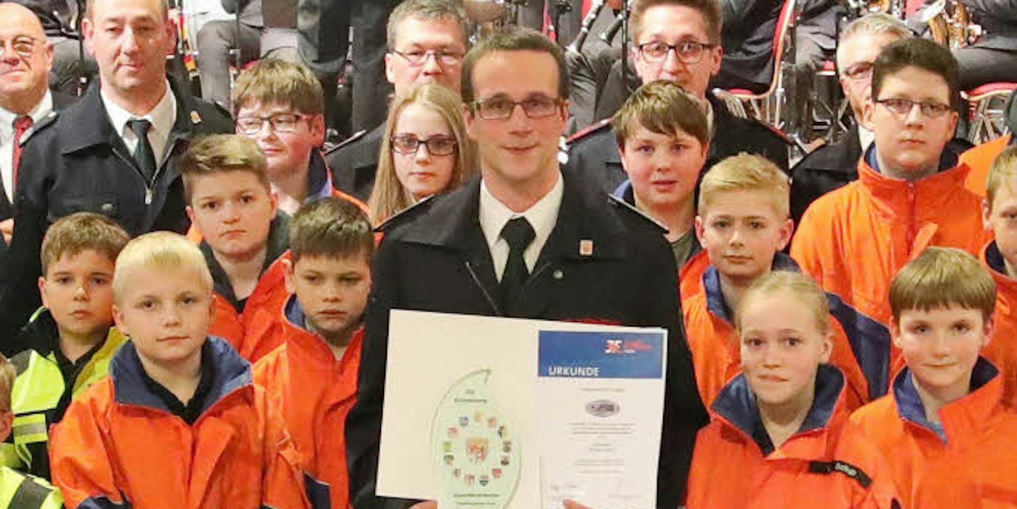 Umringt von seinen jungen Kameraden wurde Stefan Opitz für 13 erfolgreiche Jahre bei der Jugendfeuerwehr ausgezeichnet.