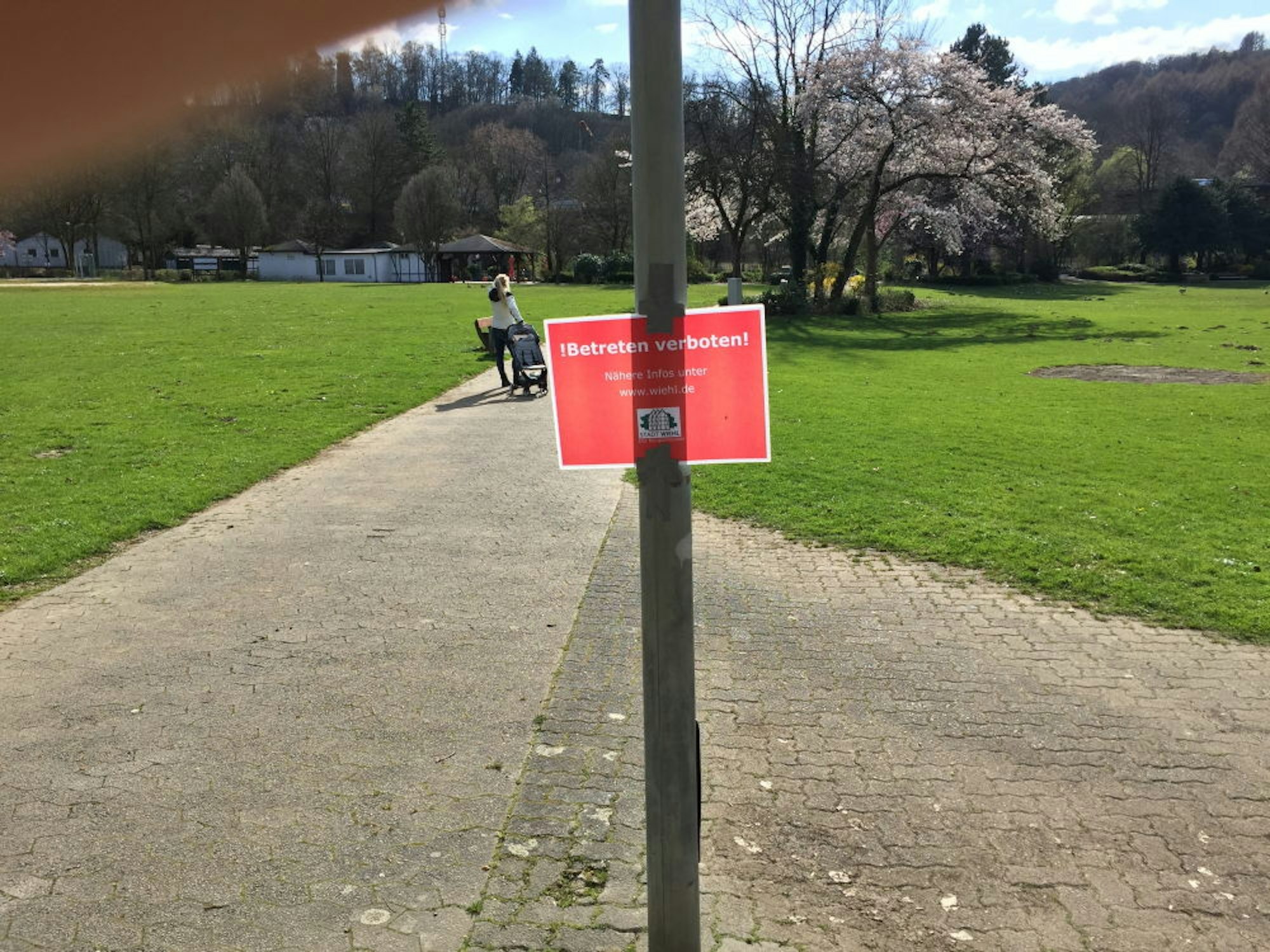 Bei locker bewölktem Himmel und strahlendem Sonnenschein ist der Wiehlpark sonst das begehrteste Ziel in der Stadt für Spaziergänger oder ein Sonnenbad. Die einzige „Zusammenrottung“ dort war am frühen Nachmittag ein Schwarm Wildgänse, der graszupfend auf der Wiese Rast machte. Trotz der knallroten Verbotsschilder der Stadtverwaltung, die das Betreten des gesamten Areals untersagten, war das nicht allen Spaziergängern aufgefallen.