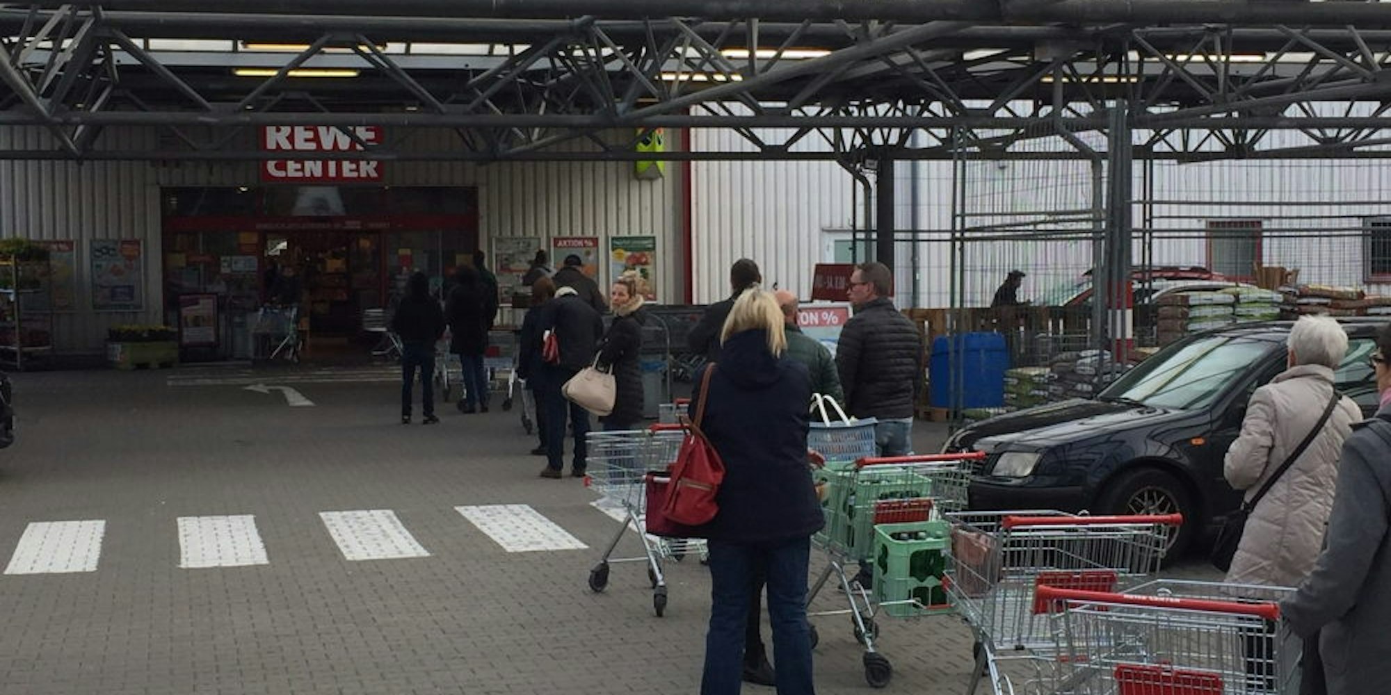 Nicht zu vermeiden war die Menschenansammlung gegen 8.30 Uhr vor dem Rewe-Markt in Bergneustadt. Im Eingang war ein Wachmann postiert, der nur alle paar Minuten eine Handvoll Kunden einließ. So sollte vor allem das Gedränge an den Kassen verhindert werden. Dort war auf dem Fußboden gelb-schwarzes Klebeband als „Abstandshalter“ aufgebracht. Schnell stauten sich draußen die Käufer 50 Meter weit auf dem Parkplatz – was sich schlimmer liest, als es war, denn alle hielten den geforderten Corona-Abstand von mindestens 1,50 Meter ein.