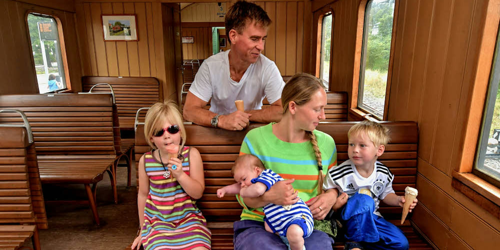 Spannende Bahnfahrt: Wolfger und Lena Sievi aus Wiehl mit den Kindern (v.l.) Lena, Hermina und Josef.