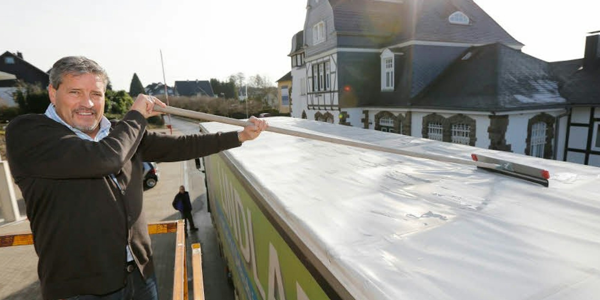 Es ist nicht schwer, sich vorzustellen wie ein Autofahrer reagiert, wenn sich plötzlich eine mehrere Kilogramm schwere Eisplatte von einem Lkw-Dach löst und im freien Fall auf die Windschutzscheibe zu schießt. „Früher waren die Decken der Lkws gewölbt und das Wasser konnte ablaufen. Heute hat man fast nur noch gerade Decken“, so Kellershohn weiter. Ein Problem, mit dem Spediteure in jedem Winter zu kämpfen haben. Eine Lösung hat der Lindlarer für seine Fahrzeuge gefunden.