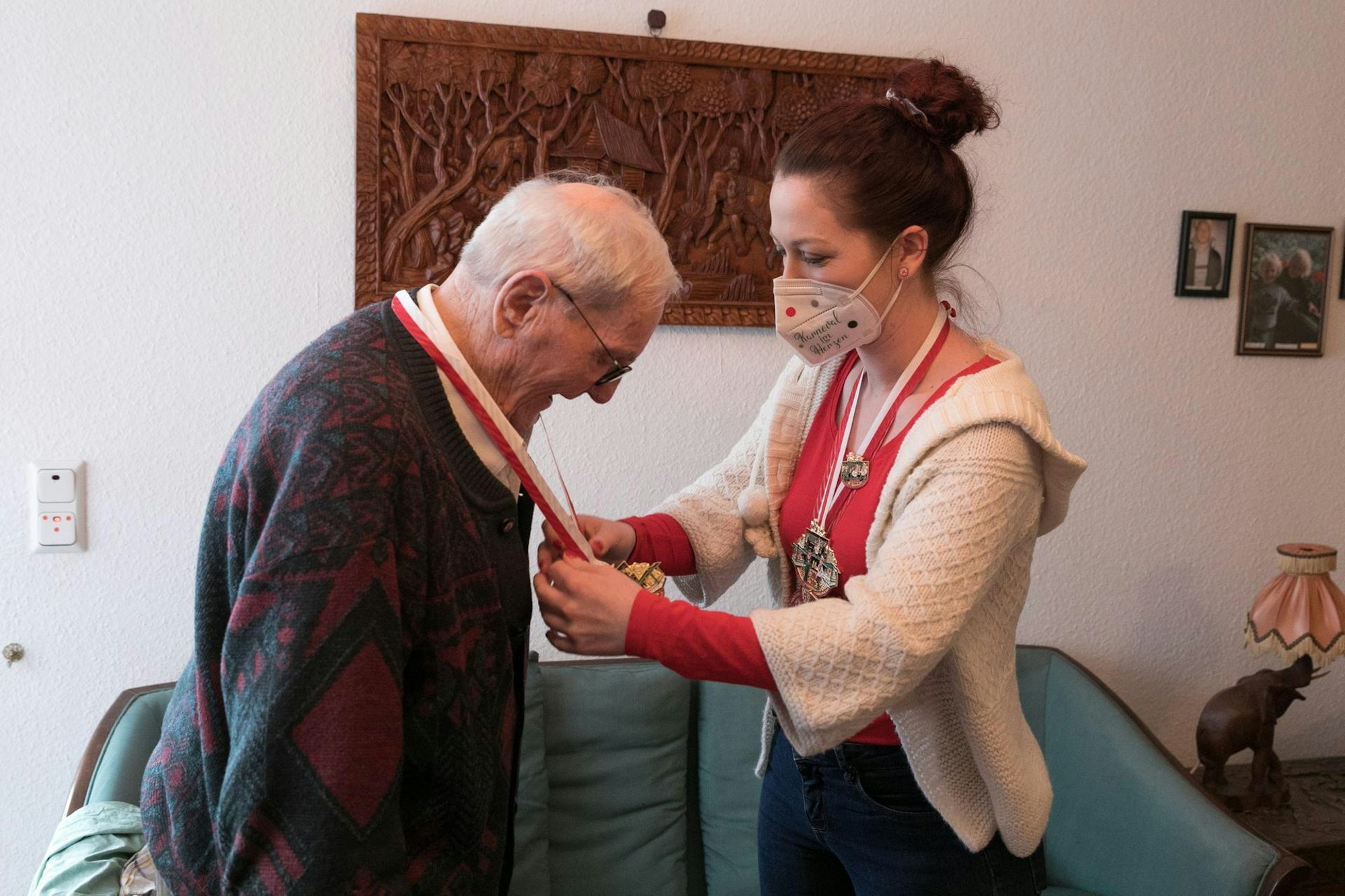 Ein wenig Karnevalsstimmung bringt aber nun der aktuelle Sessionsorden der KG Närrische Oberberger in sein Wohnzimmer. Dort hat er gute Gesellschaft von zahlreichen weiteren Orden, die dem Senior in den vielen Jahren verliehen wurden.