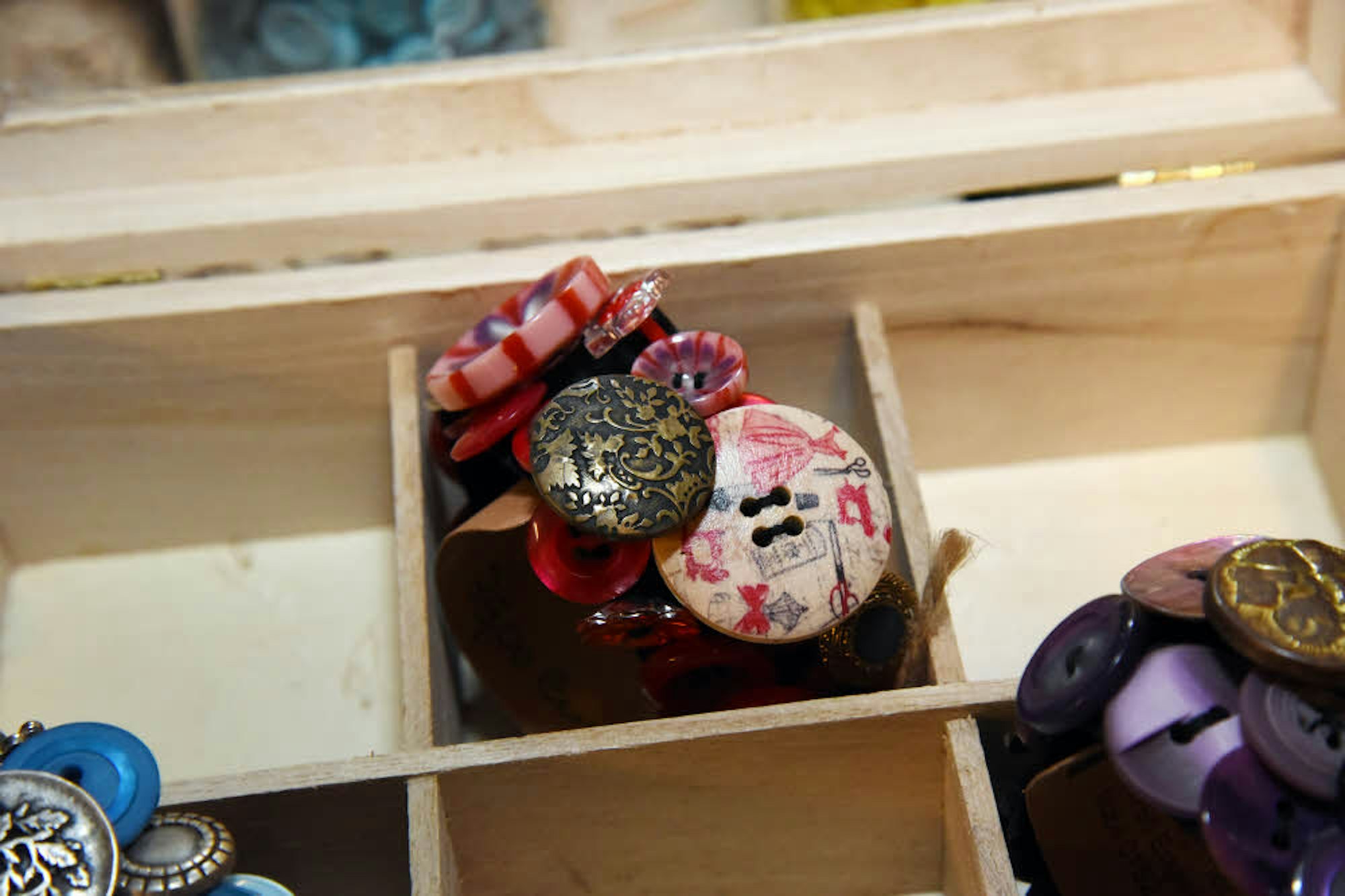 Knöpfe haben eine lange Geschichte, weiß Foerster: „Die ersten entstanden vor 5000 Jahren aus Stein. Im Mittelalter tauchten die ersten Metallknöpfe auf. Die wurden auch als Zahlungsmittel verwendet.“ Wo die vielen vielen Knöpfe heutzutage hergestellt werden, will Foerster noch herausfinden. Viel wichtiger ist für sie, dass die Knöpfe da sind – als haptisches, optisches und akustisches Erlebnis. „Es ist so ein tolles Gefühl, in ein Glas mit ganz vielen Knöpfen zu fassen. Sie fühlen sich gut an.“