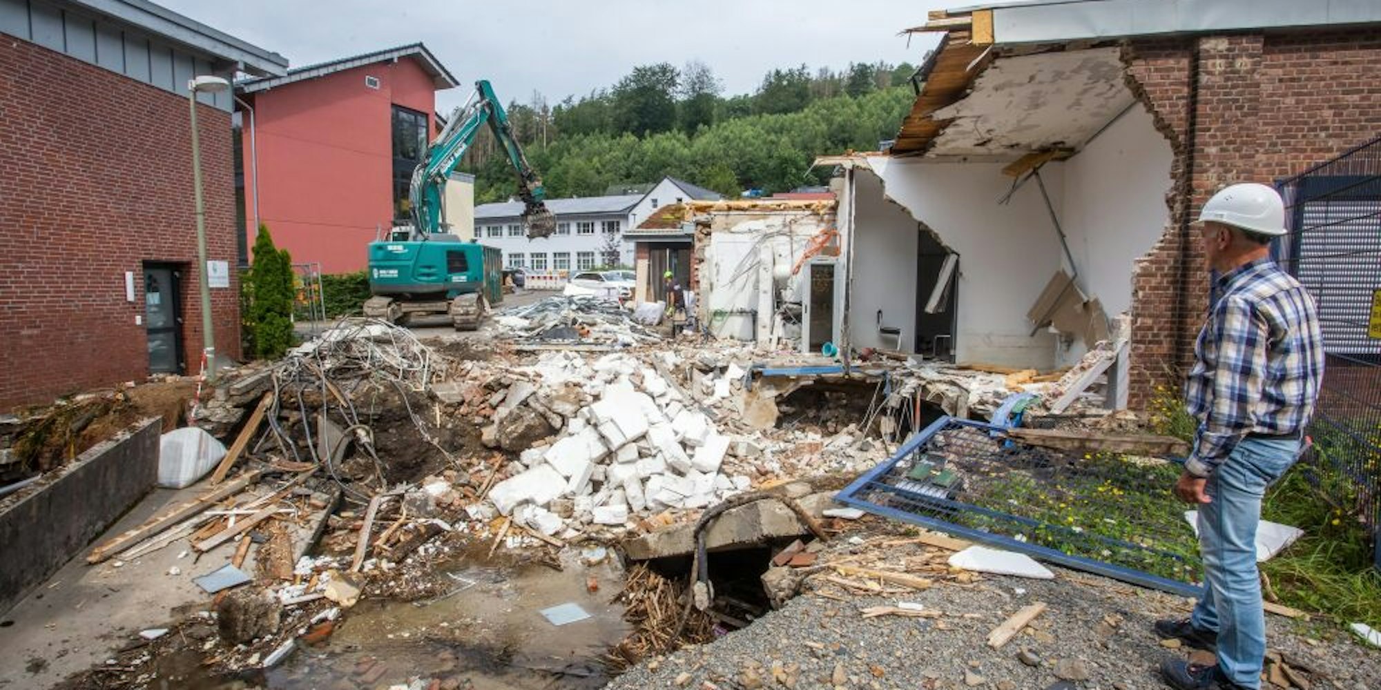 Viel Schutt, darunter Teile der eingestürzten Brücke über die Leppe und auch die Oberdecke des Durchflusskanals, die zugleich der Fußboden der darüberliegenden Arztpraxis war, liegt im Bachbett und muss jetzt mit dem Bagger weggeräumt werden, damit das Wasser wieder wieder frei fließen kann. Zwischen den Trümmern haben sich Bäume, Äste und anderes Treibgut verfangen – alles zusammen ein Abflusshindernis. „Wir versuchen, die Durchlässigkeit wieder herzustellen für den Fall, dass das Wasser noch mal steigt“, so Architekt Rother, der das ganze Areal auch entwickelt hat.