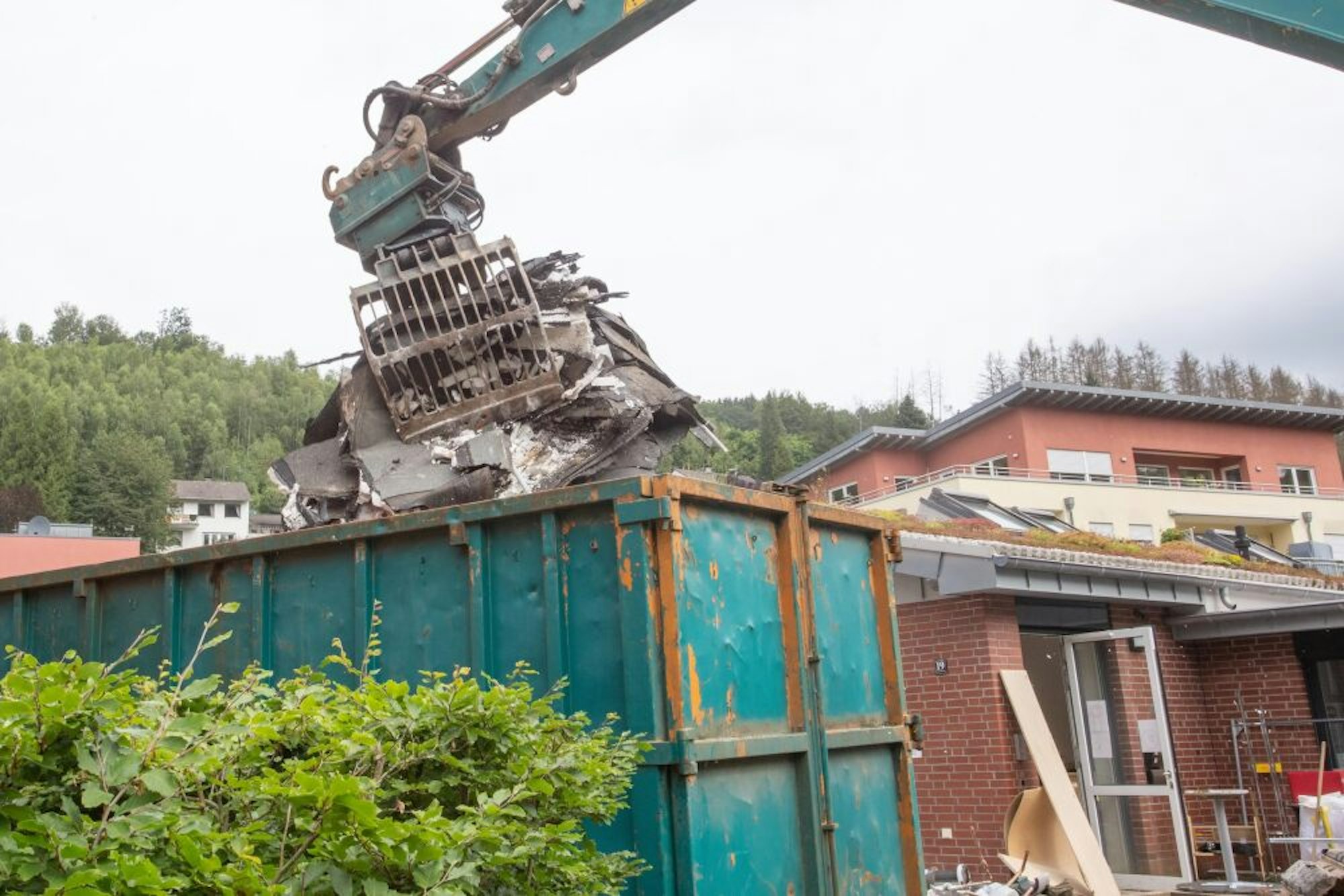 Engelskirchen – Für einen Augenblick sieht es aus, als würde die Tür in der Luft tanzen. Ein Brocken Gasbeton, der sich hinter der Klinke verklemmt hatte, fällt zu Boden. Baggerführer Wolfgang Hayer bewegt den Multifunktionsgreifer, mit dem er die Tür bewegt, mit viel Fingerspitzengefühl, sodass sich auch das Kunststoffstück von der anderen Seite der Klinke löst.