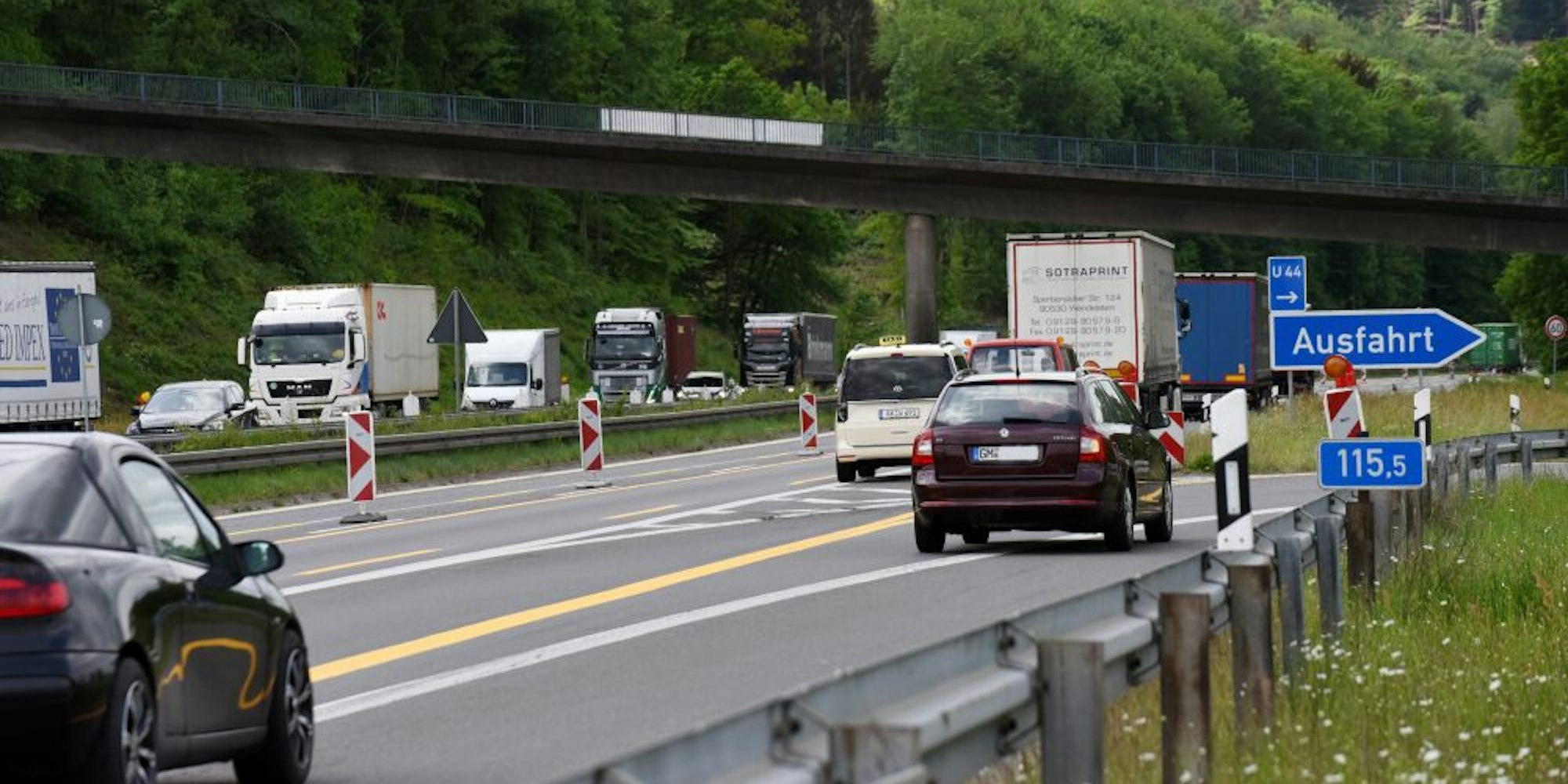 Die einspurige Verkehrsführung der letzten drei Wochen, die immer wieder Staus in beiden Fahrtrichtungen verursacht hatte, ist inzwischen einer Zweispurigkeit gewichen. Die Fahrstreifen sind jetzt allerdings verengt, deshalb darf der fließende Verkehr die Baustelle nur mit Tempo 60 passieren.