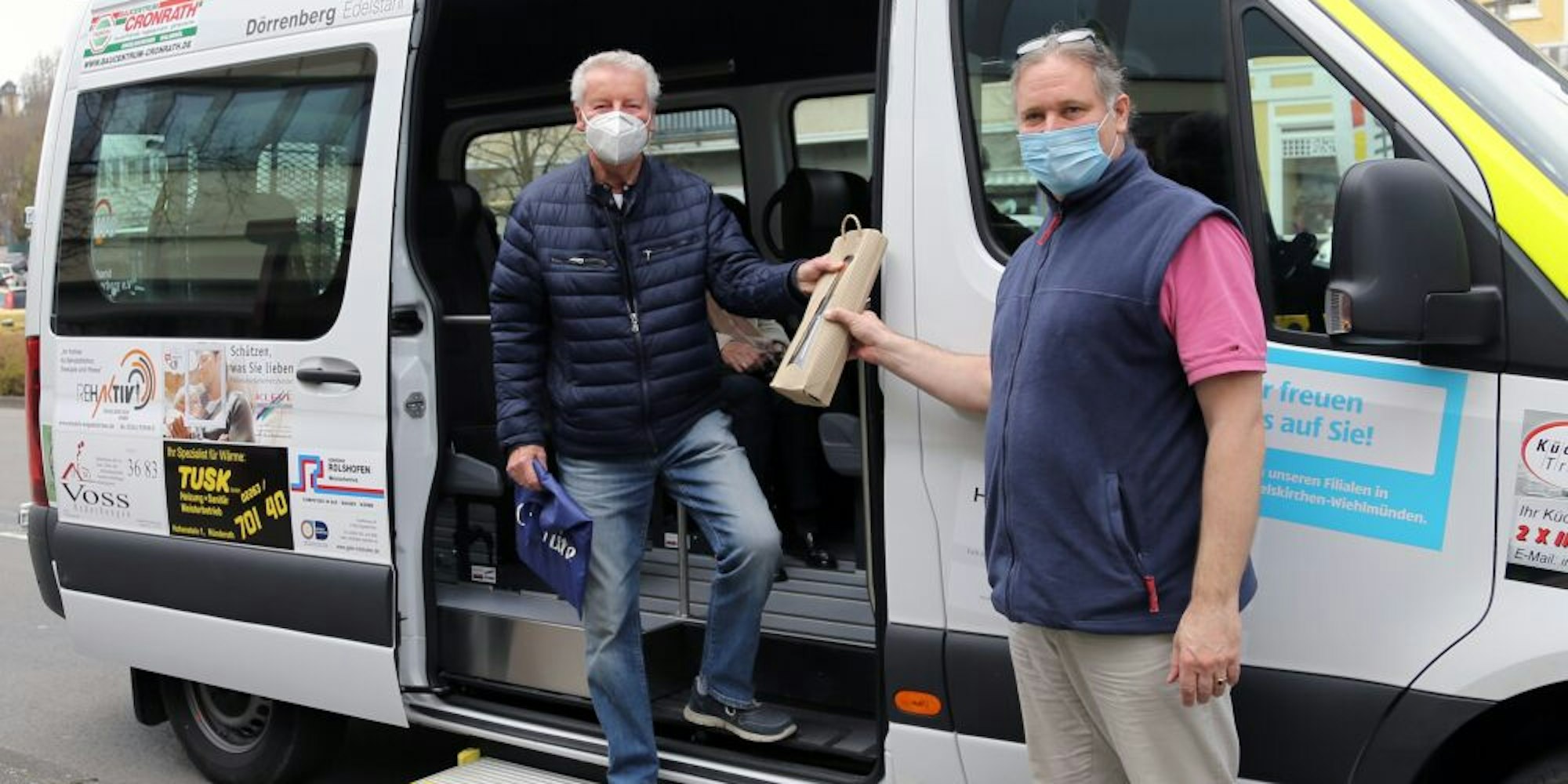 Engelskirchen – Da schaute Manfred Pauls einigermaßen verdutzt, als ihm Bürgerbusfahrer Jürgen Simeth eine Flasche Wein als Geschenk überreichte. Dabei wollte der 80-Jährige doch nur zum Impfen gebracht werden. Sollte das eine Stärkung sein? „Nein“, lacht er, „ich hatte ja keine Ahnung, dass ich der 100ste Fahrgast bin, den der Engelskirchener Bürgerbus zum Impfzentrum bringt.“