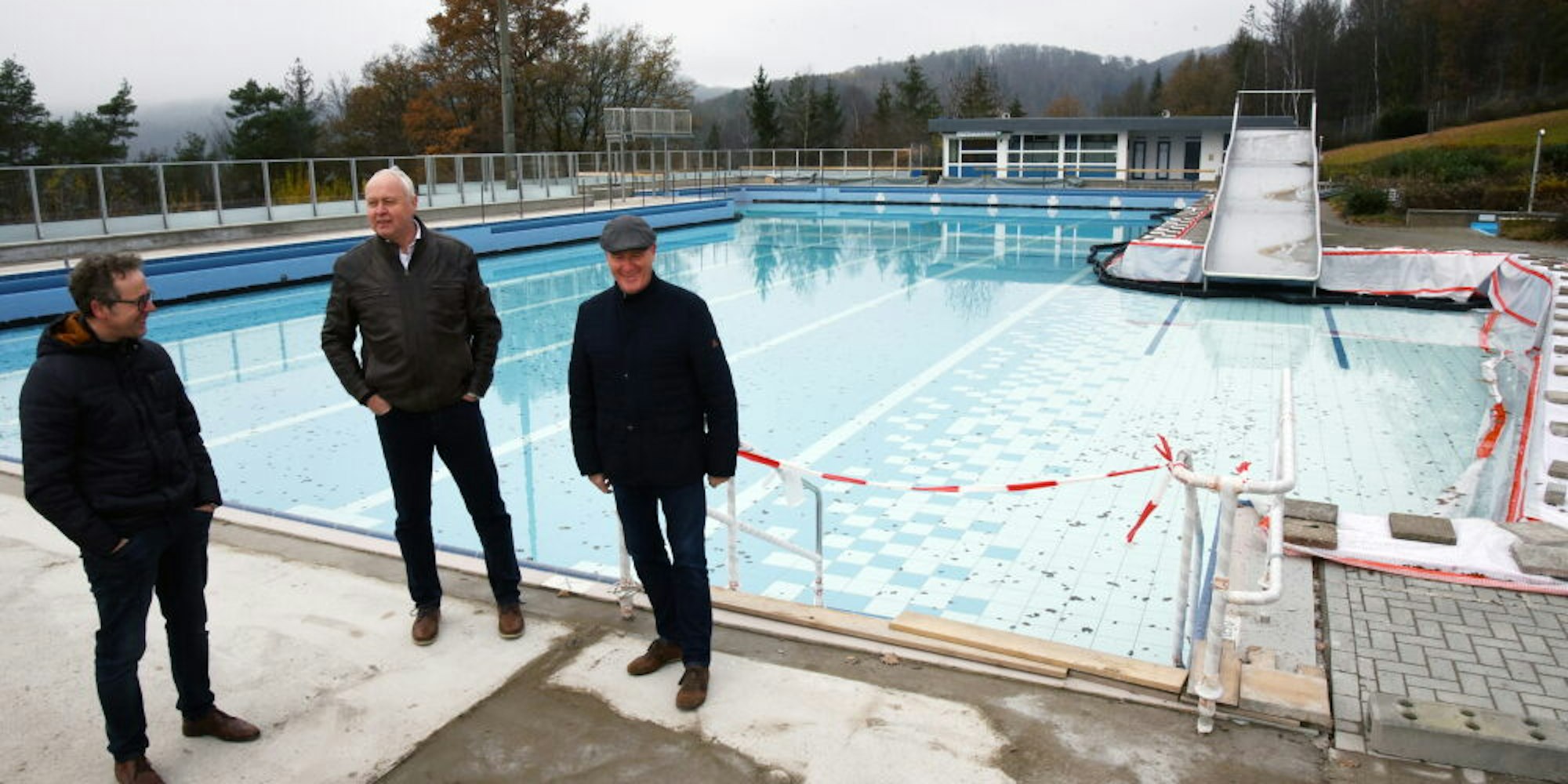 Man möchte fast reinspringen: Die Freibadsanierung ist weit gediehen, das Wetter spielt auch im Herbst mit, freuen sich Norbert Hamm (v.l.), Dr. Gero Karthaus und Michael Herbstritt-Jungbluth.