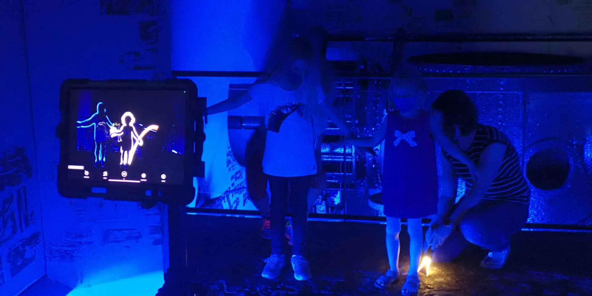 Engelskirchen – „Schau mal, Mama! Das sieht aus wie ein Dinosaurier“, ruft ein kleines Mädchen begeistert ihrer Mutter zu. Diese schaut auf den Bildschirm des Tablets und lächelt. „Du hast recht, ich sehe es auch“, sagt sie. Auf dem Display ist eine grün leuchtende Silhouette vor einem sonst schwarzen Hintergrund zu sehen. Stolz steht die Kleine mit dem Lichtpinsel in der Hand da und schaut sich ihr Kunstwerk an. „Definitiv ein Dinosaurier“, bekräftigt sie ihre Worte.