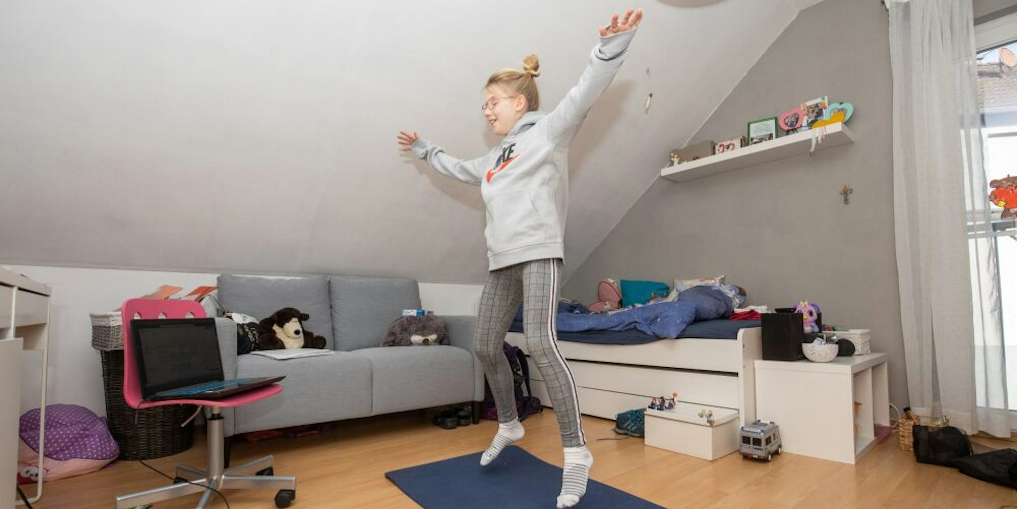 Fast wie normaler Sportunterricht: Lena turnt in ihrem Zimmer.