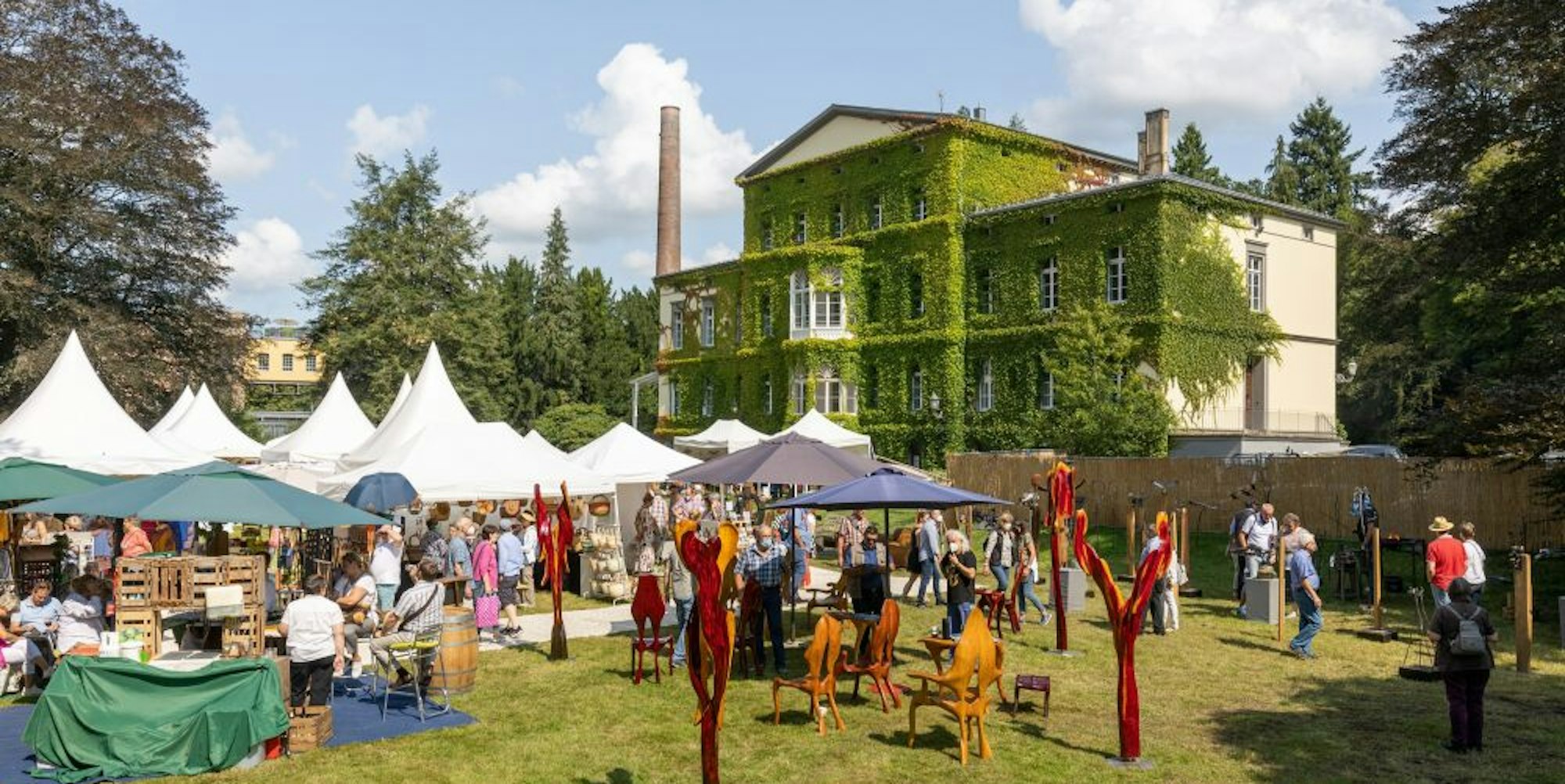 Vorbei an Schmuckständen, allerhand Gartendeko und erstaunlich viel Lakritz nimmt man langsam Live-Musik wahr. Unterhalb der Villa Braunswerth, im Schatten eines großen Baumes, haben Kristine Warmhold und Edward Bradburn aus Lohmar ihren Klangteppich ausgerollt. Zusammen sind sie Stillwater. Sie an der mittelgroßen Harfe, er im Wechsel an Bodhran oder der Bouzouki, beides irische Instrumente. „Wir sind unglaublich froh, endlich wieder ein Konzert geben zu können“, sagt Warmhold strahlend. Die Musikerin hat in der Corona-Pause die Not zur Tugend gemacht und eigene Stücke für die Harfe komponiert. „Die sind zum Glück sehr beliebt.“